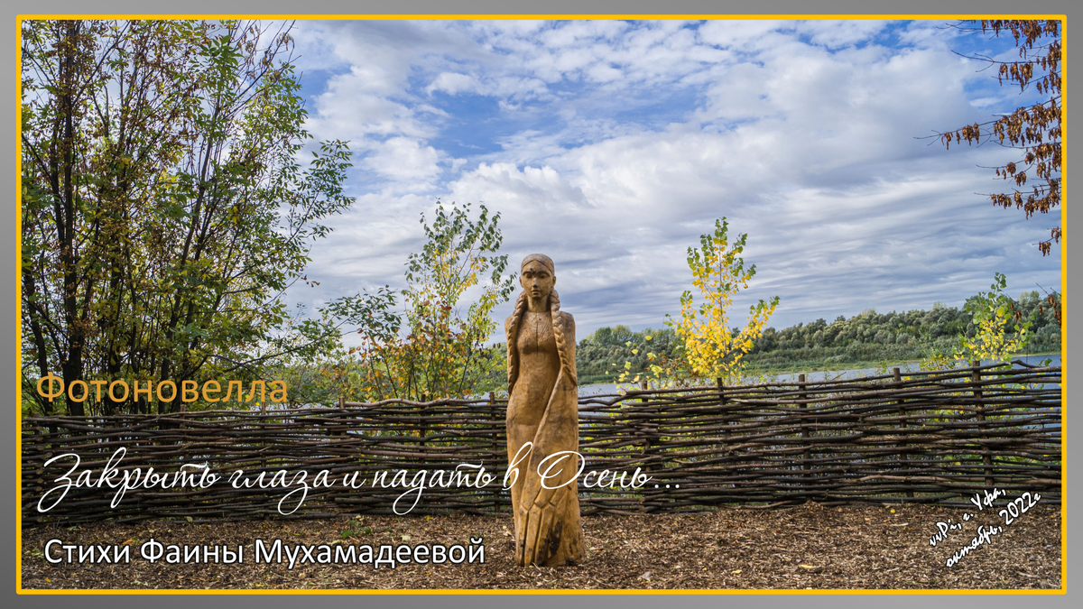 Как то осенью гулял я с фотоаппаратом по набережной р. Белой под Дежнёвской горой в Черниковке. Естественно, щёлкал затвором. Немного спустя по интернету мне приходят стихи от нашей бывшей заводчанки, туристки и запевалы у костра (тогда мы были очень молоды) Фаины Мухамадеевой с первой строчкой "Закрыть глаза и падать в Осень...". Прочитав стихи до конца, я удивился: как поэт, находясь далеко от меня, может описать, что видит и чувствует фотограф - пейзажист, гуляя по осени...