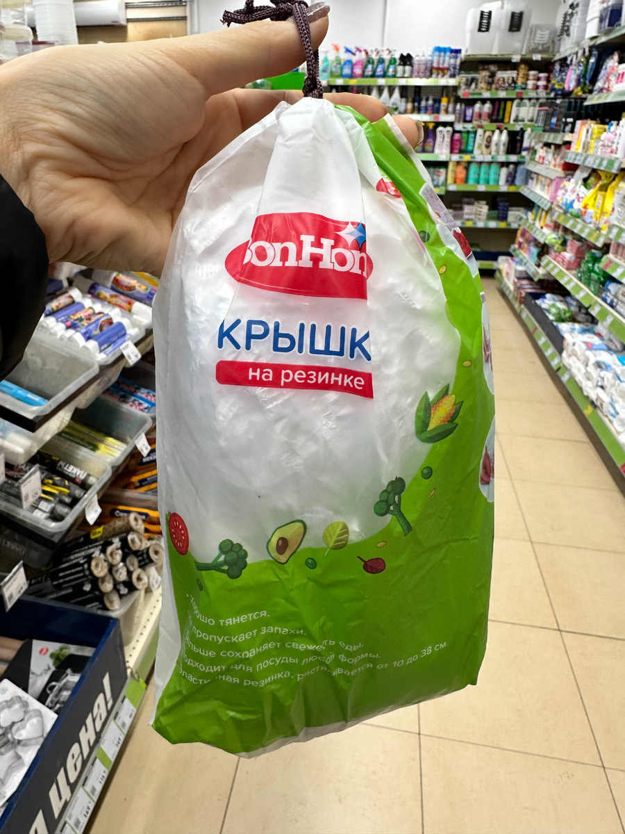 Полезная штука для хранения на кухне. Называется крышка на резинке, а по сути пакет в виде шапочки для душа. Давно такие покупаю на маркетплейсах, удобно пользоваться. Хватает небольшого количества надолго. Закрываю ими тарелки и другие кухонные емкости с едой, не перекладывая в контейнеры с крышками. Такие пакеты в Фикс Прайс сейчас стоят 87 руб. 100 штук., 38 см. Обращайте внимание на размер, есть очень маленькие.
