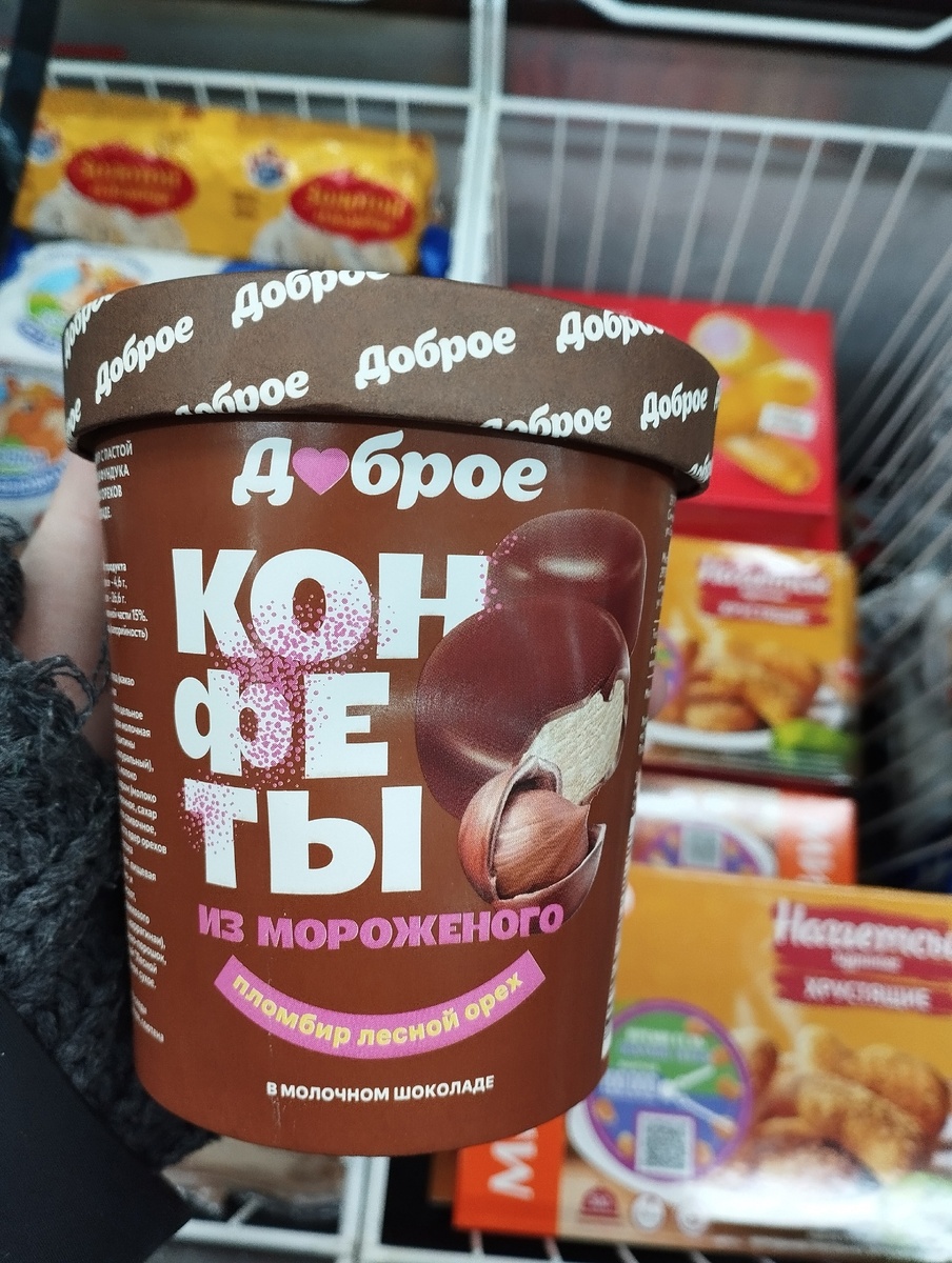 Та самая новинка, которую крайне сложно застать в холодильнике (находится она там же, где и полуфабрикаты, мороженое), ибо раскупают ее только так. А речь идет про конфеты из мороженого со вкусом лесного ореха. Подобный формат десерта мне уже попадался, я его дегустировала от другого бренда и по более высокой цене, но этим конфетам поставлю от себя заслуженные десять баллов из десяти.