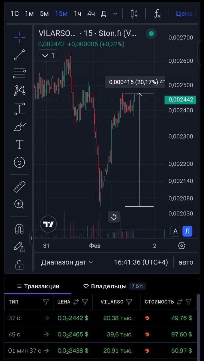 После недавнего снижения от "слабых рук" Vilarso снова развернул рынок символически в виде буквы "V". При этом вернув цену на +20%. Кто отслеживает ленту сделок, тот заметит, что я один сегодня против всех пошел на верх. Около 75% всех сделок принадлежат одному кошельку. Я тестирую новые торговые возможности, просчитываю торговые стратегии и показываю вам результат своего опыта на графике. Присоединяйтесь к движению ✈️ Все данные на скриншотах. Ликвидность, торговый оборот, рыночная капитализация и количество сделок за сегодня. Наш пул ликвидности на StonFi в среднем, приносит +/- около 20% годовой доходности для всех поставщиков ликвидности и находится в топ 10 из всего списка более 720 пулов. Торгуй по фану, пробуй, изучай. Приобрести токен💪VILARSO: 🪨 STONfi 🤑 BLUM 🪙 Gateio (https://www.gate.io/signup/GVILARSO?ref_type=103) А теперь и на бирже OKX 🤑 в разделе Web3 (https://www.okx.com/join/VILARSO) #VilarsoToken #Stonfi #Meme #Vilarso #Trading