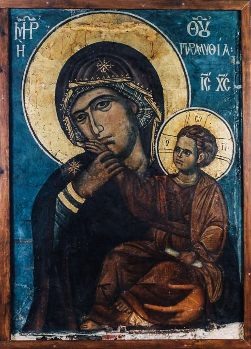 Перевод: Как защиту благодатную и спасительную обрели мы почитаемую Твою икону, Богородица, и на нее со смирением взирая, к Тебе взываем: «Владычица, ниспошли нам отраду и утешение, ибо на Тебя возлагаем надежду, грешные и смиренные. На Твою помощь надеемся недостойные. Поспеши нас избавить от бед и скорбей и умоли Сына Твоего, Христа Бога нашего, помиловать и спасти души наши».