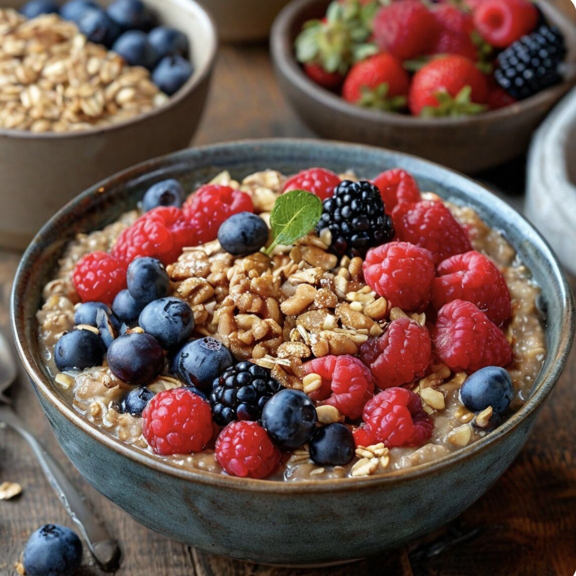 Ингредиенты: Приготовление: Пищевая ценность (на порцию): Почему этот рецепт полезен: Овсянка богата растворимыми клетчаткой, что способствует нормализации работы кишечника и поддерживает уровень холестерина. Ягоды — это отличный источник антиоксидантов, которые помогают бороться с воспалениями и старением клеток. Орехи содержат полезные жиры и белки, которые помогают поддерживать энергию на протяжении дня и благоприятно влияют на сердце. Такой завтрак обеспечит тебя необходимыми питательными веществами для начала дня. Хотите больше полезных рецептов? Подписывайтесь на "Питание с умом" и готовьте вкусно каждый день!