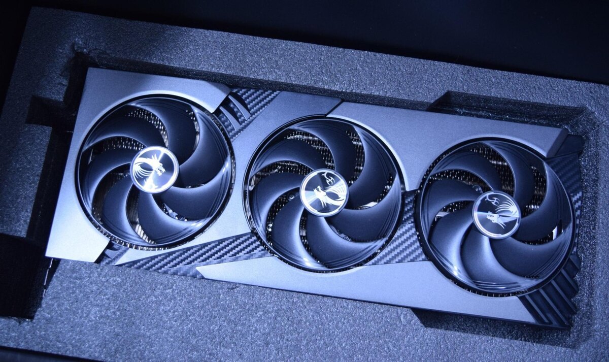 Новый радиатор выглядит как модифицированный вариант решения RTX 4090 SUPRIM X. Ключевые изменения коснулись дизайна кожуха и радиатора: более аккуратный передний кожух с черными и серебристыми вставками, а также V-образные вырезы для RGB-подсветки. По бокам карты добавлена новая акцентная пластина с RGB-подсветкой, на которой изображены логотип MSI и дракон. Подсветка активируется при запуске карты.