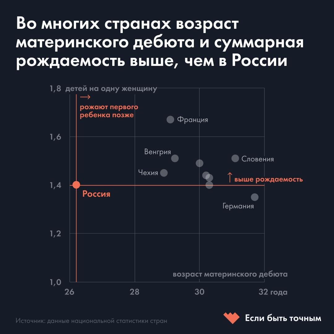 26,2 года — таков средний возраст матери при рождении первенца в России. Это один из самых низких показателей в Европе. В странах Западной и Северной Европы этот возраст значительно выше: во Франии, Швеции и Литве он превышает 28–29 лет, а в Италии, Германии, Португалии и Швейцарии — более 30 лет. В Восточной и Центральной Европе цифры также выше российских: в Болгарии — 26,4 года, в Чехии — 28,8 года, а в Польше — 27,5 года. Это следует из данных Human Fertility Database. При этом в этих странах коэффициент суммарной рождаемости выше, чем в России: 1,68 во Франции, 1,45 в Чехии, а в России — 1,4. Это показывает, что возраст матери не является единственным или решающим фактором, влияющим на рождаемость. «Факторы рождения первенца сильно отличаются от факторов, влияющих на рождаемость вторых и последующих детей, — считает демограф Алексей Ракша. — Их гораздо больше и они разнообразнее. В первую очередь, это факторы межличностных и межполовых отношений, семейной истории и так далее» Возр