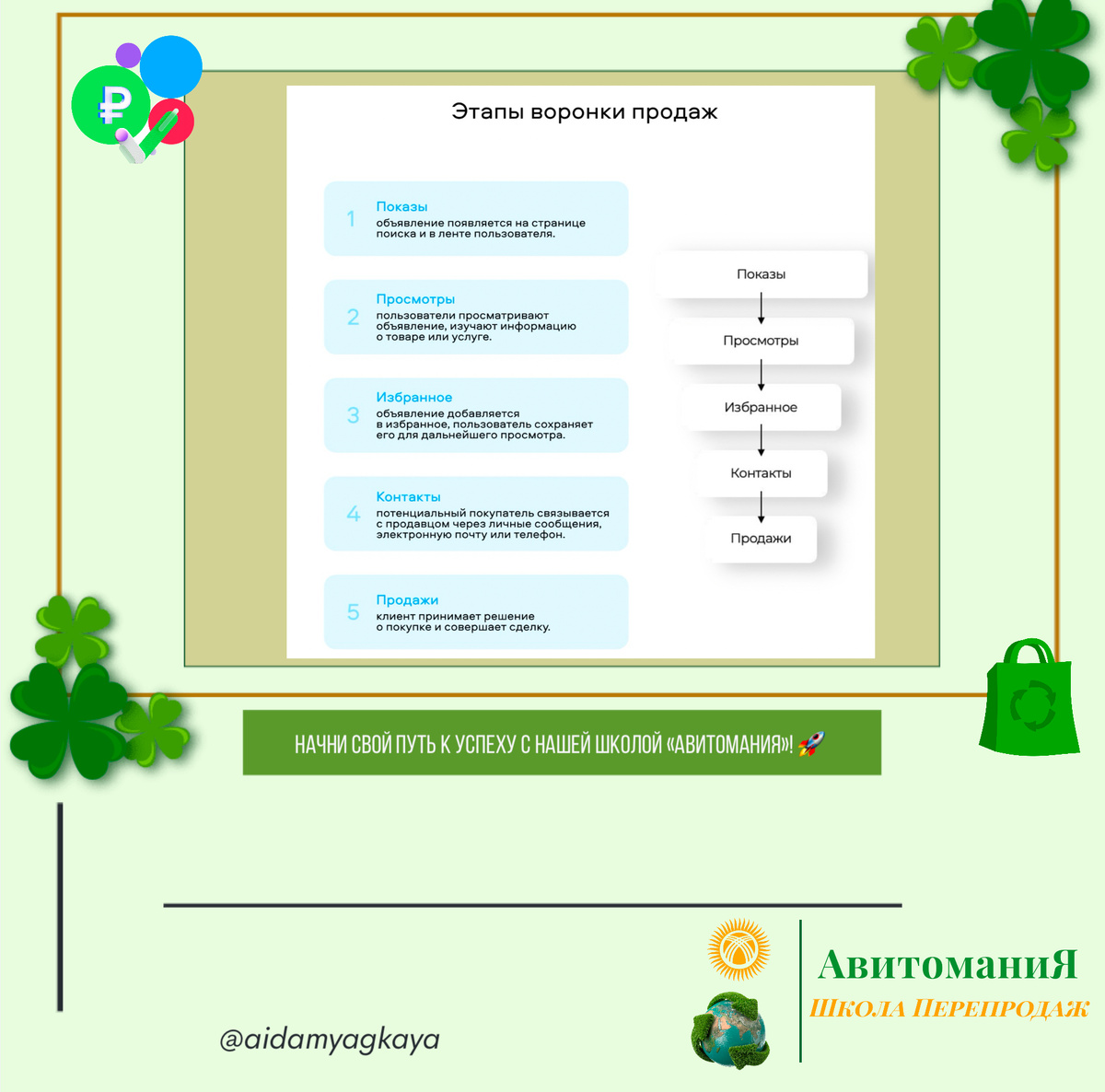 Воронка продаж Авито — это модель, описывающая путь клиента от первого знакомства с продуктом до завершения покупки. Понимание этого процесса позволяет бизнесу оптимизировать свои усилия на каждом этапе, увеличивая шансы на успешную продажу. _____________ Присоединяйтесь к школе “Перепродажа Авитомания”! Хотите не просто бонусы, но и стабильный доход? Наша школа научит зарабатывать на перепродаже товаров на Авито! 👉 Подписывайтесь на наш Telegram-канал “Школа Перепродажа Авитомания” и начните зарабатывать уже сегодня! _____________ #перепродажа #АвитоманиЯ #обучениеперепродажам #перепродажанавито #авитобизнес #школаперепродаж #авитомания #перепродажазанулякурс #перепродажакакначать #нишаперепродаж #успехвперепродажах #осознанноепотребление #экообразжизни #вторичноеиспользование #экологичныйбизнес
