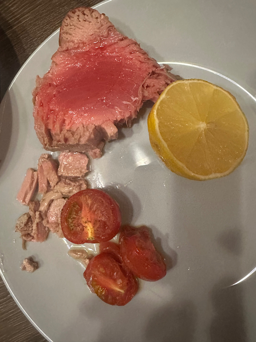 Эта неделя у меня была весьма разнообразной и рыбной. Вот с рыбы и начнем))) Я запекала тунца, его нужно лишь немного пропечь, чтобы внутри он остался розовый. С ним же запекла помидоры Запекала сибаса с лимоном и розмарином И стейки из семги На гарнир - картошка Еще готовила филе индейки в сметане Жареные острые куриные ножки На гарнир - рис Так и подавала: Из остатков риса сделала салат И пицца дважды. Все вышеперечисленное ели на обед и ужин, а пиццу доедали на завтрак И бутерброды с лососем собственного посола На завтрак готовила сырники Макароны с сосисками дважды Творог с вареньем и йогурты Суп готовила дважды: чечевичный на курином бульоне И уху из головы лосося Шикардосная получилась неделя)))