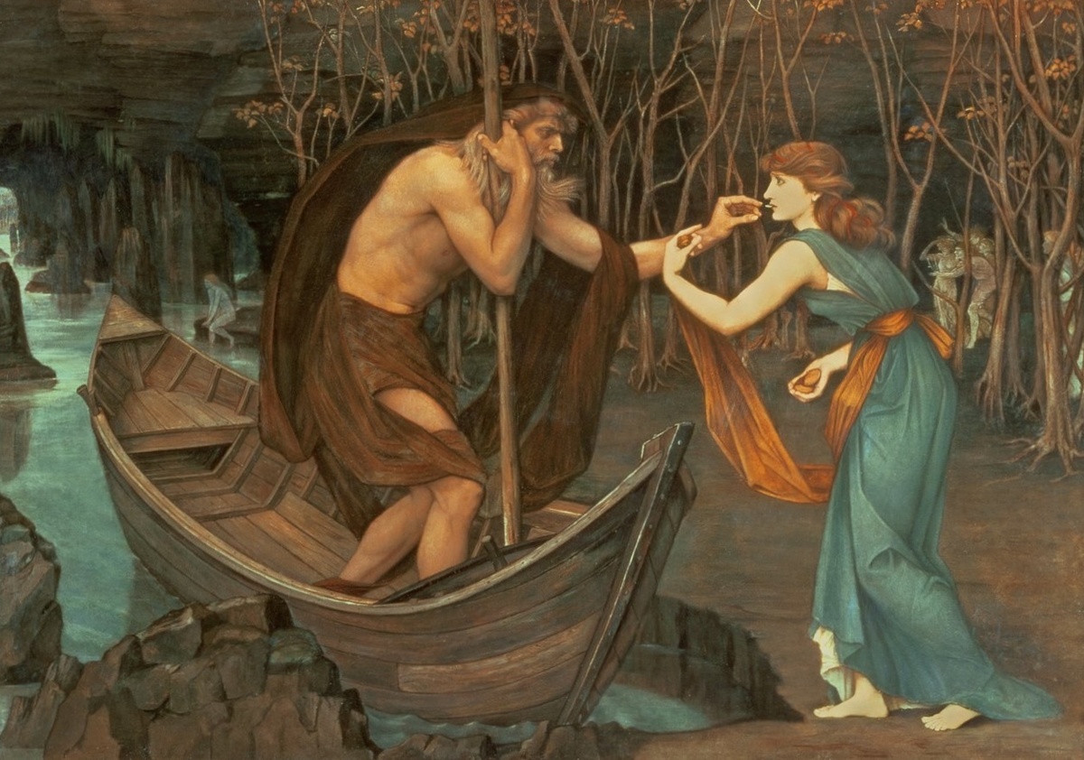 Перед вами картина "Харон и Психея" (1883) художника-прерафаэлита Джона Роддама Спенсера Стэнхоупа. Психея — героиня многих античных мифов, в которых описывается её связь с богом любви Амуром (Эротом). Самая известная интерпретация отношений этой яркой парочки изложена в романе "Метаморфозы, или Золотой осёл" древнеримского писателя II века Апулея. По Апулею, Психея была такой прекрасной принцессой, что даже великолепная Афродита завидовала её красоте. Богиня любви стала постоянно искать возможность насолить Психее и за ее красоту и, конечно, за связь девушки с её сыном, поэтому придумывала для неё различные смертельно опасные испытания. Например, добыть воду из Стикса — одной из рек в царстве мёртвых — и принести из подземного царства от Персефоны (Прозерпины) ящик с чудесными притираниями. Путь в сумрачное царство непрост, и вступать туда с пустыми руками нельзя. Поэтому Психея взяла с собой ячменные медовые лепешки и особые монеты, которые нужно отдать Харону — мрачному старцу-пере