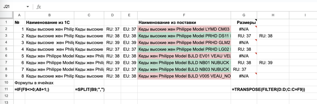 Мне присылали список артикулов на фотосъемку. Наличие товара на складе можно было проверить в 1С. В ручную довольно утомительно и времязатратно проверять каждую позицию. Поэтому я выгрузил все товары категории и бренда. Теперь мне нужно было выделить совпадения в списках и вывести имеющихся в наличии размеров. Задача: сравнить один список с другим, выделить те ячейки в столбце, которые встречаются в обоих списках, добавить строку справа с дополнительной информацией, которая есть в сравниваемом списке. О том, как форматировать списка и выделение дубликатов, вывод дополнительной информации по дубликатам, можно увидеть в таблице Образец функций. Ниже даны пояснения о формулах и используемых функциях. Используемые функции Формулы =SPLIT(B2;»,») – разделяет название товара и его размеров; =ТРАНСП(FILTER(D:D;C:C=F6)) – находит одинаковые строки в списках и выводит размеры, функция ТРАНСП размещает информацию вдоль строк; =СЧЁТЕСЛИ(C:C;F2)>=1 – сравнивает два списка на наличие совпадений, ес