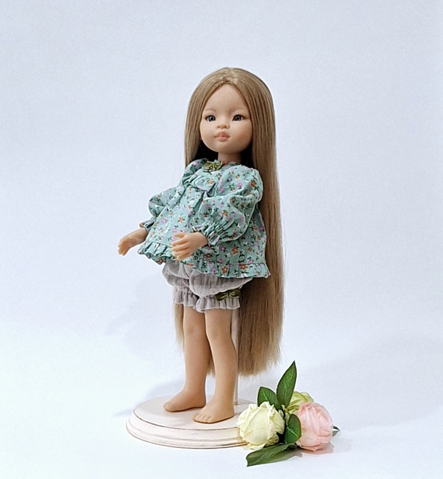 Всем привет! Любителям кукол, рукоделия и тем кто случайно заглянул на мой канал! Хочу поделиться процессом изготовления симпатичного костюма для кукол Паола Рейна ростом 32,0-34,0 см или других кукол такого же размера. Такое изделие можно сшить не только для кукол, но и для детей! Для штанишек я выбрала двухслойный муслин, но это может быть любая плательная хлопчатобумажная ткань. Ситец, перкаль, поплин, фактурный хлопок, с плотностью 80-110 г/м2, а так же тонкий вельвет, бархат или велюр. Начинаем с кроя штанишек. Они без бокового шва. При раскладке выкройки на ткани учитываем долевые и поперечные нити ткани. Если Ваша ткань имеет большую сыпучесть, припуски шва можно проклеить флезилином плотностью 25 г/м2. Длина изделия всегда расположена по долевой нити, она проходит вдоль кромки ткани. Ткань вдоль кромки не растягивается. Ширина изделия, это поперечная нить, она проходит перпендикулярно кромке, это ширина ткани. Здесь ткань даёт небольшое растяжение. Швы изделия