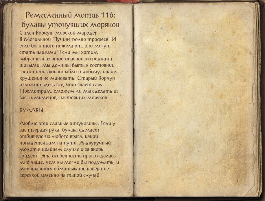 В Могильной Пучине полно трофеев! И если боги того пожелают, они могут стать нашими! Если мы хотим выбраться из этой опасной экспедиции живыми, мы должны быть в состоянии защитить свои корабли и добычу, иначе крушения не миновать! Старый Ворчун изложит здесь все, что знает сам. Посмотрим, сможем ли мы сделать из вас, шельмецов, настоящих моряков!