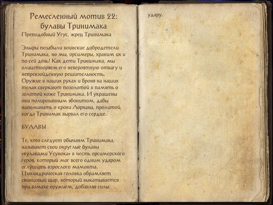 Преподобный Угус, жрец Тринимака Эльфы позабыли воинские добродетели Тринимака, но мы, орсимеры, храним их и по сей день! Как дети Тринимака, мы олицетворяем его невероятную отвагу и непревзойденную решительность. Оружие в наших руках и броня на наших телах сверкают позолотой в память о золотой коже Тринимака. И украшены они полированным эбонитом, дабы напоминать о крови Лорхана, пролитой, когда Тринимак вырвал его сердце. Информация и иллюстрации взяты из клиента игры The Elder Scrolls Online. Навигатор по статьям канала. БУЛАВЫ Те, кто следует обычаям Тринимака, называют свои округлые булавы «кулаками Усунока» в честь орсимерского героя, который мог всего одним ударом оглушить взрослого мамонта. Цилиндрическая головка обрамляет свинцовый шар, который выкатывается при взмахе оружием, добавляя силы удару. КИНЖАЛЫ Наши кинжалы куются из лучшей стали и разветвляются на два пронзающих клинка, отображая двойственную натуру Тринимака, Золотого героя, - и истребителя врагов, и защитника свое