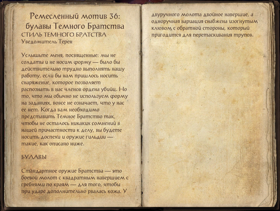 Услышьте меня, посвященные: мы не солдаты и не носим форму - было бы действительно трудно выполнять нашу работу, если бы нам пришлось носить снаряжение, которое позволяет распознать в нас членов ордена убийц. Но то, что мы обычно не используем форму на заданиях, вовсе не означает, что у нас ее нет. Когда вам необходимо представить Темное Братство так, чтобы не осталось никаких сомнений в нашей причастности к делу, вы будете носить доспехи и оружие гильдии - такие, как описано ниже.