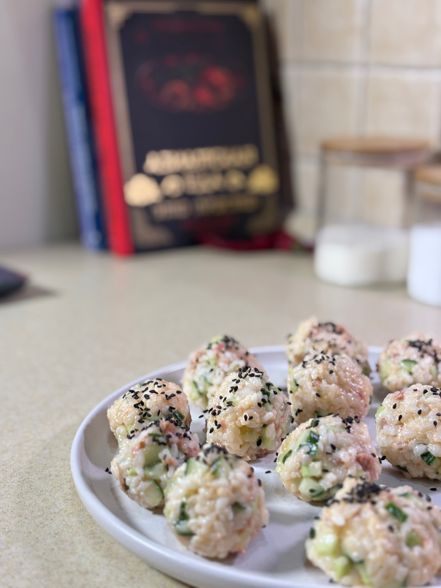 Подпишись и сохраняй простой, пошаговый рецепт 👌 Подготовьте ингредиенты: ✅рис для суши или круглозерый рис 300 гр ✅соус Ширачи 20 гр ✅майонез 80 гр ✅тунец консервированный 240 гр ✅огурец 240 гр ✅рисовый уксус 2 столовые ложки ✅соль 2 чайные ложки ✅сахар 1 столовая ложка ✅кунжут по желанию и вкусу Шаг 1 Рис хорошо промыть и оставить стекать воду на 10 минут Шаг 2 300 гр риса высыпьте в кастрюлю и залейте 375 мл воды, доведите до кипения, варите 5 минут в кипящей воде. Уберите с горячей плиты и настаивайте рис 10 минут. Шаг 3 Смешайте рисовый уксус, соль и сахар. Нагрейте и размешайте до растворения соли и сахара. Шаг 4 Рис выложите на блюдо или противень, полейте получившейся уксусной заправкой, хорошо перемешайте, накройте салфеткой и дайте остыть. Шаг 5 Мелко нарежьте огурец и смешайте его с тунцом в большой миске. Шаг 6 В миску добавьте остывший рис, соус Ширачи, майонез. Хорошо перемешайте. Шаг 7 Сформируйте из получившейся массы шарики при помощи мешочка или руками, по