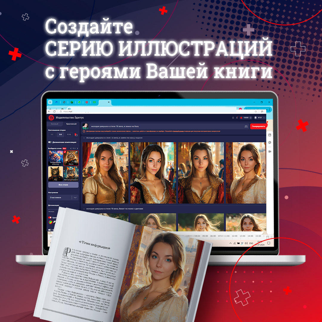 Если Вы решили самостоятельно подготовить иллюстрации для своей книги, воспользуйтесь нашим онлайн-сервисом: На сайте Издательства Эдитус выберите “Издать книгу”, а затем “Подготовлю самостоятельно”. Если Вы еще не являетесь пользователем сервиса — пройдите быструю и простую регистрацию. После этого перед Вами откроется три варианта: “Создать проект”, “Перейти в редактор” и “Загрузить свой файл”. Вам потребуется первый — автоматическая подготовка макетов, в котором Вы также сможете самостоятельно сделать вёрстку будущей книги. Нажав “Создать проект”, перед Вами откроются “Мои проекты”, но для создания иллюстраций Вам потребуется нажать на значок профиля в верхнем правом углу и выбрать “AI изображения”. Ознакомьтесь с краткой инструкцией и приступайте к работе. Для того, чтобы создать изображения с героем Вашей книги, необходим либо подобрать прототип героя, например, фотографию похожего человека, либо сначала сгенерировать его при помощи подробного описания. Для этого воспользуйтесь