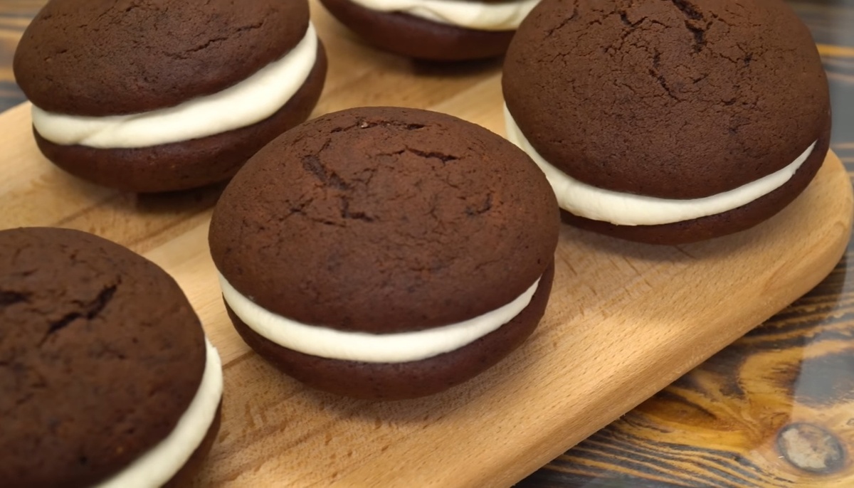 - Мука — 250–300 г - Сахар — 100–130 г - Ванильный сахар — 10 г - Какао-порошок (несладкий) — 50 г - Молоко — 150 мл - Сметана (10–15%) — 150 г - Яйцо — 1 шт. - Сливочное масло — 100 г - Разрыхлитель — 3 г - Сода — 3 г - Соль — 3 г - Творожный сыр — 150 г - Сахар — 100 г - Сливки (33–35%) — 200 мл 1. В миске смешиваем молоко и сметану. 2. Добавляем яйцо и перемешиваем. 3. В другой миске соединяем муку, сахар, ванильный сахар и просеянное какао. 4. К сухим ингредиентам добавляем разрыхлитель, соду, соль и нарезанное кубиками сливочное масло. 5. Постепенно вводим молочно-сметанную смесь, замешивая однородное тесто. 1. Застилаем противень бумагой для выпечки. 2. С помощью кондитерского мешка или ложки выкладываем небольшие кружочки теста диаметром около 4 см. 3. Ставим противень в предварительно разогретую до 180°C духовку. 4. Выпекаем печенье 10–12 минут, пока оно не станет золотистым. 5. Вынимаем из духовки, даём остыть и аккуратно снимаем с бумаги. 1. Взбиваем сливки с сахаром до