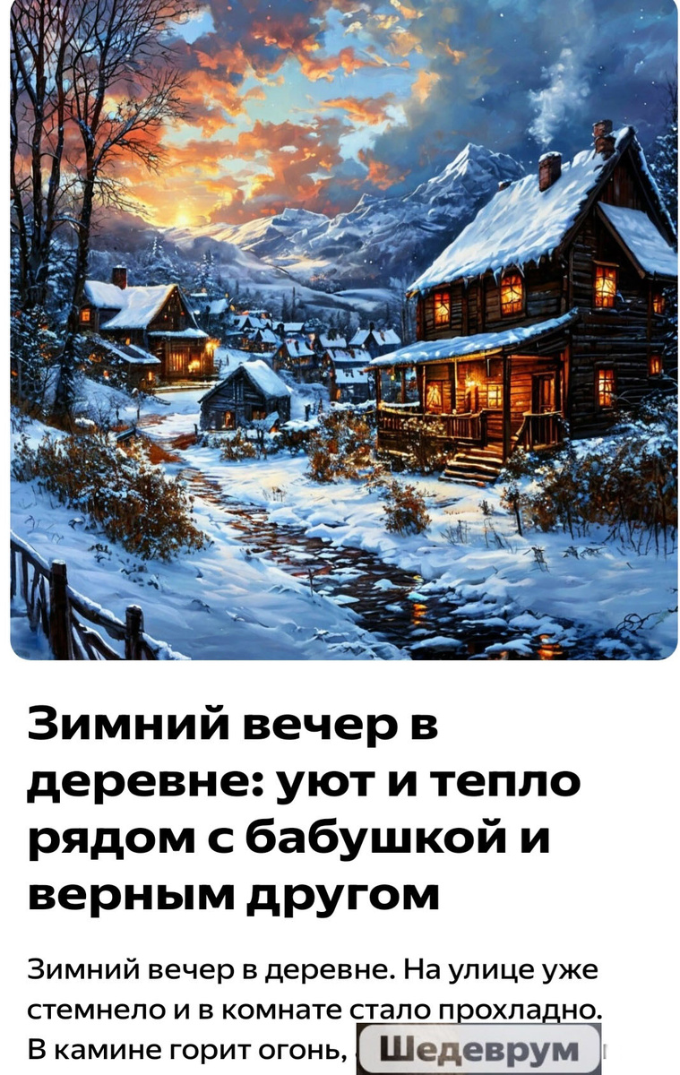 «Зимний вечер в деревне. На улице уже стемнело и в комнате стало прохладно. В камине горит огонь, а на диване рядом с ним сидит бабушка и её верный друг - вельштерьер Вега. Они рассматривают фотографии из старого альбома, который бабушка бережно хранила многие годы. На фотографиях изображены разные моменты из жизни бабушки и дедушки, а также их дети и внуки. Бабушка с любовью рассказывает о каждом человеке, изображённом на фотографии, и о том, как они жили в те времена. Она вспоминает о том, какие были традиции и обычаи, какие праздники отмечали и какие песни пели. Вега внимательно слушает бабушку и смотрит на фотографии. Он чувствует себя частью этой истории и понимает, что его хозяйка и дедушка были очень близки друг к другу. Он тоже хочет сохранить эти воспоминания на всю жизнь. Зимний вечер в деревне кажется таким уютным и тёплым. Бабушка и Вега сидят у камина и наслаждаются тишиной и спокойствием, которые царят в этом доме. Они чувствуют себя защищенными и любимыми, и это делает их счастливыми.» ШЕДЕВРУМ 30.01.2025