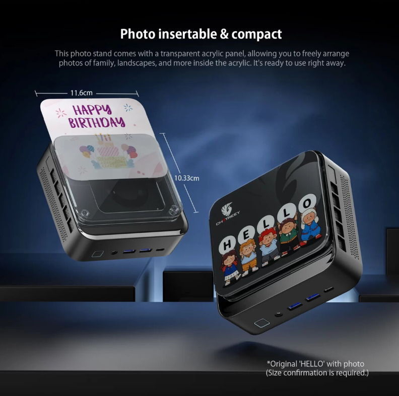 Chatreey AN3P — это новый компактный ПК, который выделяется не только своими солидными техническими характеристиками, но и интересной дополнительной функцией: возможностью превратить верхнюю панель устройства в фоторамку. Разнообразие портов и вариантов подключения делают его универсальным решением для большинства повседневных задач. Сердцем мини-ПК AN3P стал достаточно мощный процессор AMD Ryzen 7 7735HS работающий в тандеме с встроенным графическим чипом AMD Radeon 680M. Покупателям предлагается на выбор несколько комплектаций устройства: как система без оперативной и встроенной памяти, так и с предустановленной оперативной памятью объемом от 16 до 32 Гб и твердотельным накопителем на 512 Гб или 1 Тб. Также поддерживается возможность самостоятельной установки двух модулей оперативной памяти DDR5 и два SSD формата M.2 2280. Chatreey AN3P обладает компактными размерами 132 на 132 мм и высотой всего 55 мм. На лицевой стороне расположились два порта USB 3.0, один USB-C, аудиоразъем и кно