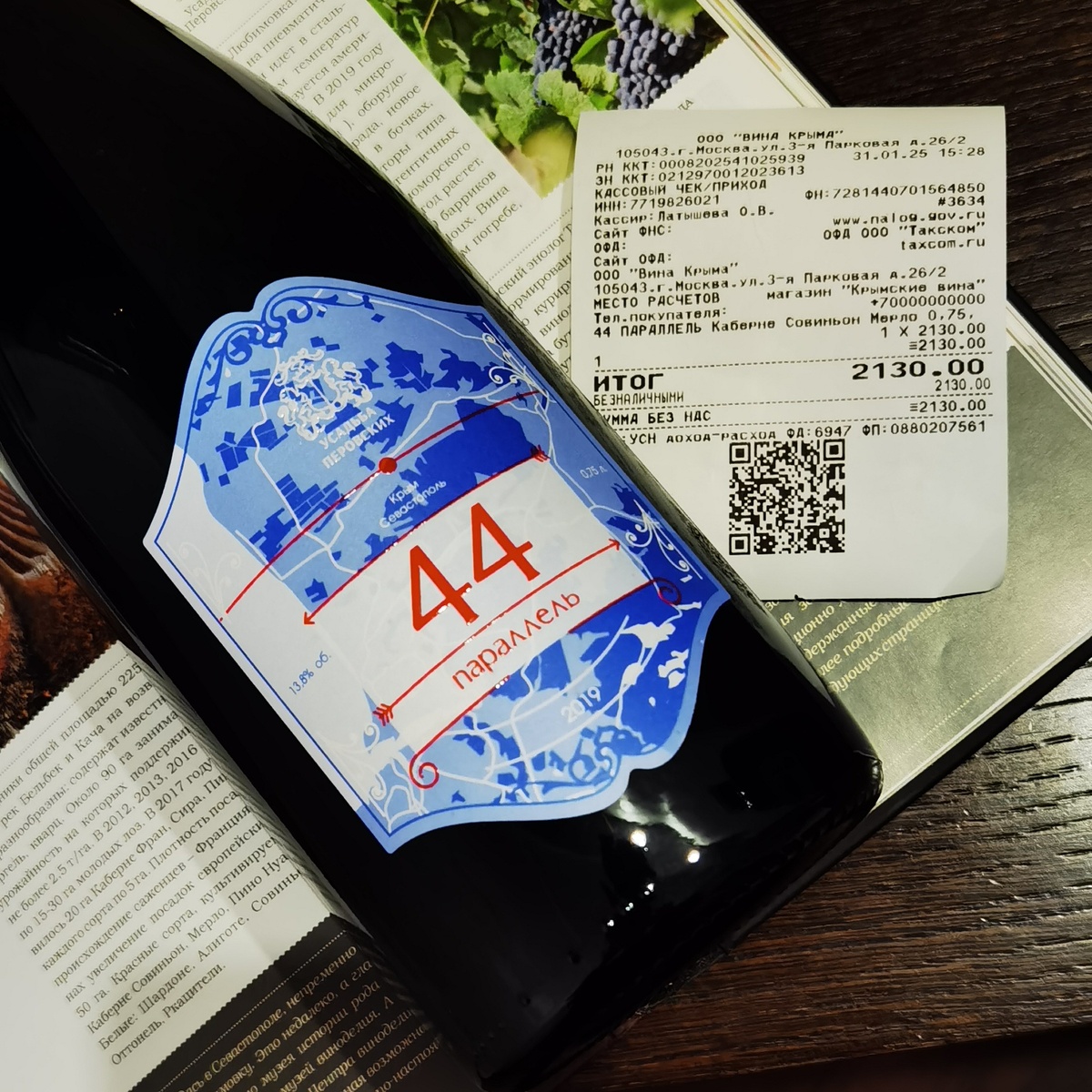 Январь 2025 года. Вот и пришло время первого обзора в новой рубрике 2025 года (а их будет всего 12) «Вино от Дзена». Напомню почему такое название. Всё связано с монетизацией. Доход у моего канала небольшой, но дело же не в деньгах, поэтому я решил в 2025 году ввести рубрику, смысл которой в том, что раз в месяц я буду покупать вино на полученный от канала доход и посвящать ему отдельный обзор. В конце прошлого года, анонсируя Итоги 2024 года, я предложил своим подписчикам угадать число вин, попробованных мной за прошедший год и которое окажется в итоговом списке. А победитель (тот кто окажется ближе всего к этому числу) сможет выбрать вино, которое и станет первым вином в этой рубрике. Победителем этого небольшого конкурса стал канал Севастополь. Про Вино и в качестве вина был выбрано вино из Крыма «44 Параллель» 2019 от «Усадьбы Перовских». Изначально цена покупки была ограничена суммой в 2 тыс. рублей. Вино было куплено в сети «Крымские вина» за 2130 руб. Небольшой перебор с учетом