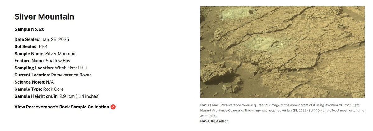 Сегодня я хочу очень коротко рассказать о работе сразу двух ровером. Perseverance Роверу удалось запечатать и поместить в контейнер гильзу с керном. Поэтому в списке образцов появилась новая строка Керн назвали Серебряная гора (Silver Mountain) и он пока самый маленький из всех взятых кернов - всего 3 сантиметра. Средняя длина кернов - 6 сантиметров, максимальная - 7,5. Прошу прощения, что в предыдущей статье указал неправильный номер: не 25й, а 26й. Да и если смотреть - это не аккуратно вырезанный кусочек скалы, а просто какой-то бесформенный камушек. После этого команда огляделась: И решила еще раз поработать долотом: У меня сложилось впечатление, что команда попытается взять еще один образец в этом же месте. И, в случае удачи, заменить "плохой" образец "хорошим", благо технические возможности так сделать есть. Надо посмотреть. Curiosity Это ровер находится на поверхности Марса в четыре раза дольше, чем Персик - у него идет 4437 сол. За последнюю неделю он провел ревизию своих коле