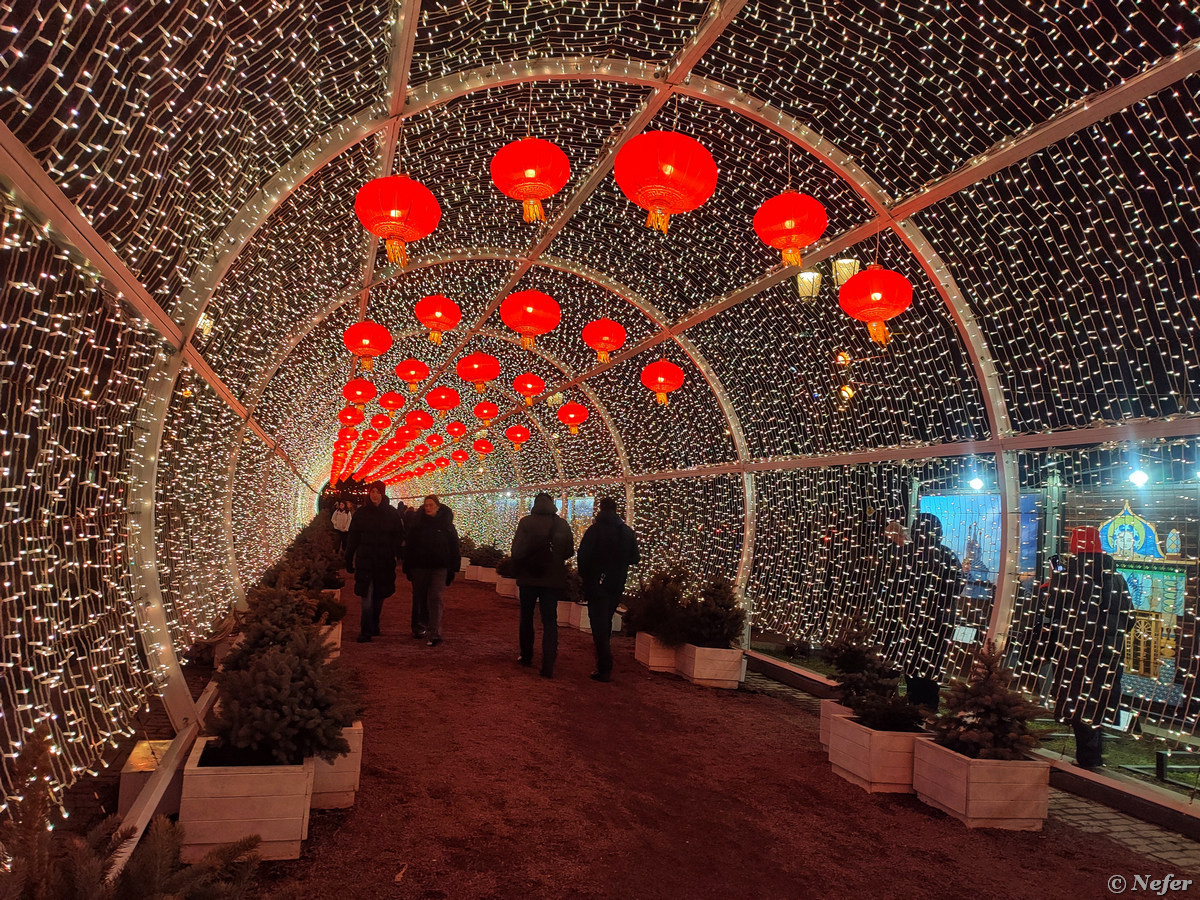 Прошлась по городу, посетила популярные локации в центре. Москва все еще новогодняя, а теперь и с китайским колоритом. Весь маршрут занял у меня буквально часа полтора. Начала с Пушкинской площади. Там вокруг фонтана световая инсталляция, кружевные вензеля - теплый желтый свет, снежинки - синий холодный. За памятником Пушкину установлена светящаяся арка. На фоне нее фигура поэта выглядит эффектно, особенно, если смотреть с противоположной стороны улицы. На углу, где "Известия" установлена елка в комплексе со световыми кружевами. В Новопушкинском сквере гигантская арка с китайскими мотивами, а на Тверском бульваре светодиодный тоннель, украшенный китайскими фонариками. На Тверской площади расположилась, пожалуй, самая китайская локация. Там веера и монетки цянь, на всех скамейках сидят плюшевые панды, с которыми все фотографируются. В глубине ближе к сцене установлена змея - символ года, а вокруг драконы. Все светится, сверху висят красные фонарики. Народу прилично. Чтобы что-то сфотогр