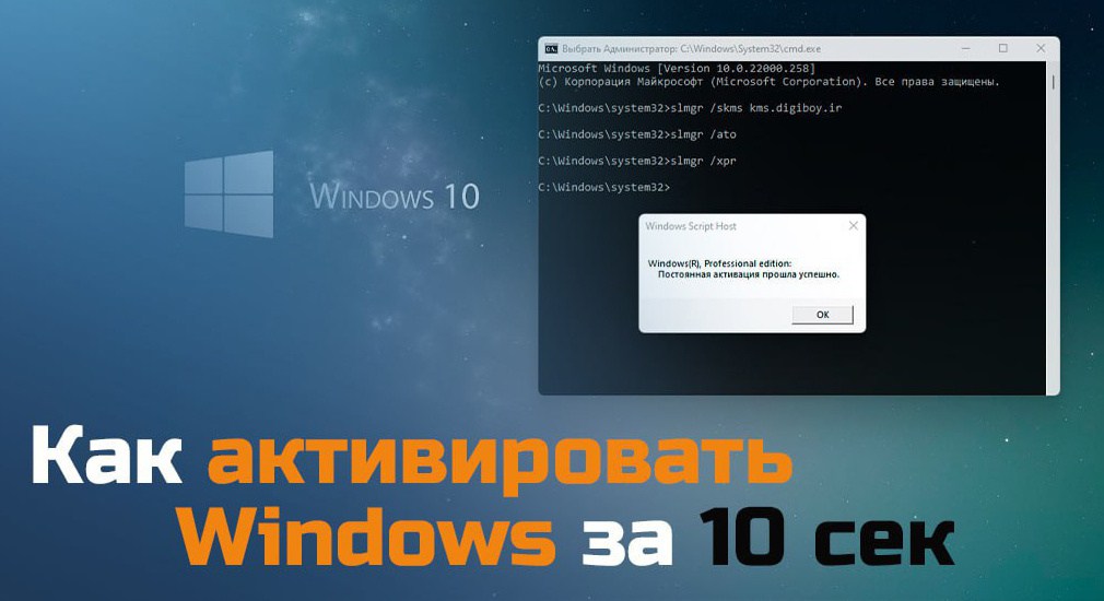 ΠΠ°ΠΏΡΡΠΊΠ°Π΅ΠΌ ΠΊΠΎΠΌΠ°Π½Π΄Π½ΡΡ ΡΡΡΠΎΠΊΡ ΠΎΡ ΠΈΠΌΠ΅Π½ΠΈ ΠΠ΄ΠΌΠΈΠ½ΠΈΡΡΡΠ°ΡΠΎΡΠ° (ΠΡΡΠΊ -> Π² ΠΏΠΎΠΈΡΠΊΠ΅ ΠΏΠΈΡΠ΅ΠΌ CMD, ΠΆΠΌΡΠΌ ΠΏΡΠ°Π²ΠΎΠΉ ΠΊΠ½ΠΎΠΏΠΊΠΎΠΉ ΠΌΡΡΠΈ - ΠΠ°ΠΏΡΡΡΠΈΡΡ ΠΎΡ ΠΈΠΌΠ΅Π½ΠΈ Π°Π΄ΠΌΠΈΠ½ΠΈΡΡΡΠ°ΡΠΎΡΠ°) ΠΈ Π²Π²ΠΎΠ΄ΠΈΠΌ ΡΠ»Π΅Π΄ΡΡΡΠΈΠ΅ ΠΊΠΎΠΌΠ°Π½Π΄Ρ: Β«slmgr /ipk W269N-WFGWX-YVC9B-4J6C9-T83GXΒ» - ΡΡΡΠ°Π½ΠΎΠ²ΠΈΡ ΠΊΠ»ΡΡ; Β«slmgr /skms kms.digiboy.irΒ» β Π·Π°ΡΡΠ°Π²Π»ΡΠ΅Ρ Windows ΠΏΠΎΡΡΠ»Π°ΡΡ Π·Π°ΠΏΡΠΎΡ ΠΏΡΠΎΠ²Π΅ΡΠΊΠΈ Π»ΠΈΡΠ΅Π½Π·ΠΈΠΈ Π½Π° ΡΠ΅ΡΠ²Π΅Ρ; Β«slmgr /atoΒ» β ΠΏΠΎΡΡΠ»Π°Π΅Ρ Π·Π°ΠΏΡΠΎΡ Π½Π° ΠΏΡΠΎΠ²Π΅ΡΠΊΡ; Β«slmgr /xprΒ» β ΠΏΠΎΠΊΠ°Π·ΡΠ²Π°Π΅Ρ ΡΠ»Π΅Π΄ΡΡΡΡΡ Π΄Π°ΡΡ ΠΏΡΠΎΠ²Π΅ΡΠΊΠΈ (Π΅ΡΠ»ΠΈ ΡΠ΅ΡΠ²Π΅Ρ Π±ΡΠ΄Π΅Ρ ΡΠ°Π±ΠΎΡΠ°ΡΡ, Π²ΡΠΏΠΎΠ»Π½ΠΈΡΡΡ Π°Π²ΡΠΎΠΌΠ°ΡΠΈΡΠ΅ΡΠΊΠΈ). ΠΠΎΡΠ»Π΅ Π·Π°Π²Π΅ΡΡΠ΅Π½ΠΈΡ Π²Π²ΠΎΠ΄Π° Π²ΡΠ΅Ρ