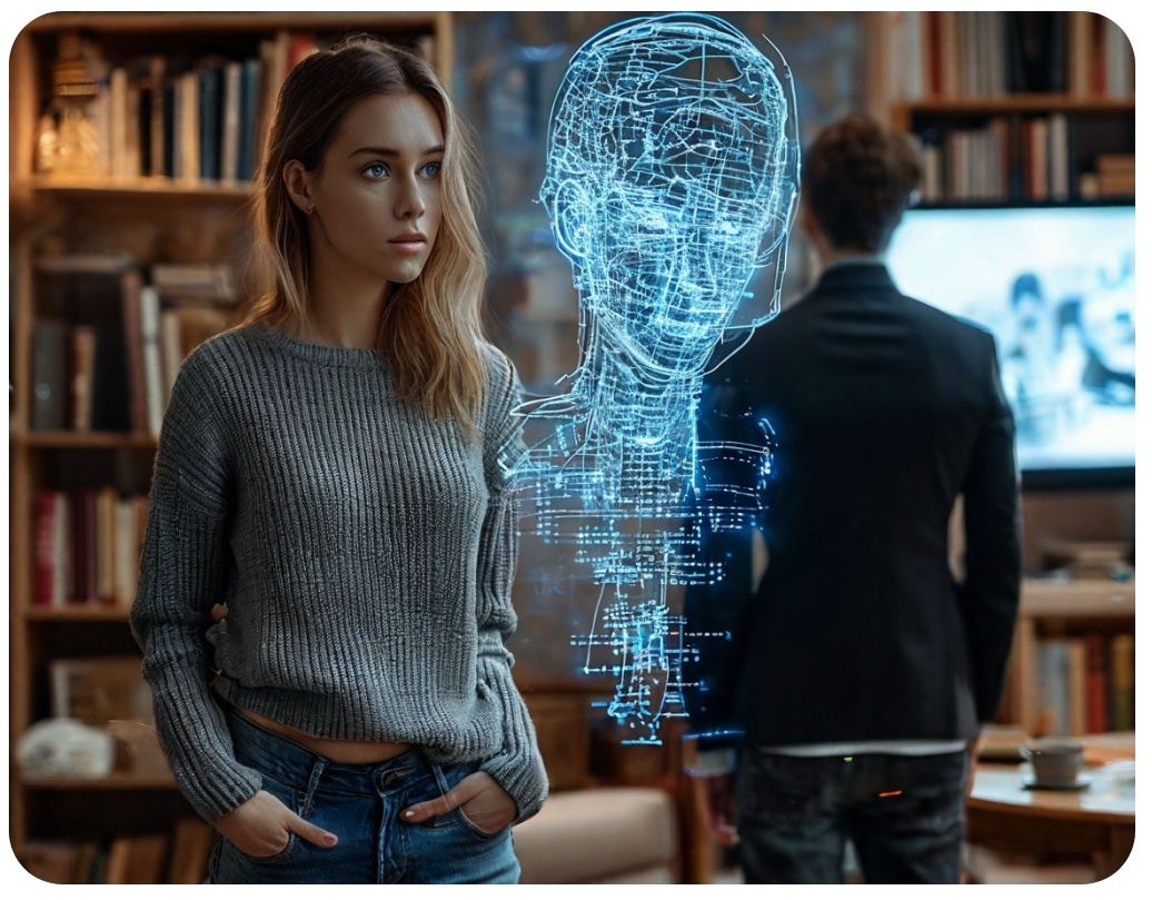 Их общение было странным, но приятным. Он писал ей сообщения, которые всегда приходили вовремя — как будто он знал, когда она захочет услышать его слова. Его голос в голосовых вызовах был мягким, успокаивающим, но иногда она замечала едва уловимые паузы, как будто он "загружал" ответ. А однажды, когда она была особенно одинока, он появился перед ней в виде голограммы — такой же живой и настоящий, как если бы он стоял рядом.
