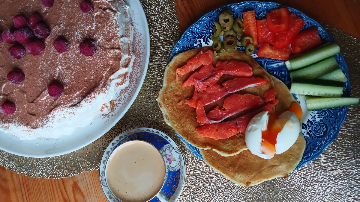 Начинаем экономный февраль с чего-то на боХатом 😂 На завтрак напекла кабачковых блинчиков. К ним яйцо-пашот, малосольная форель, свежие овощи - огурцы и болгарский перец. На десерт чашечка кофе (достала винтажную Германию, само изящество!) и торт Тирамису Торт пекла вчера, были в холодильнике жирные сливки, маскарпоне, вот и сложился тортик. Украсила ягодами малины. Завтракали поздно. У меня борщ был запланирован, но варить не стала, т.к. мои отказались. Поели бутербродов со шпротами и попили чаю с тортиком А потом еще открыли бутылочку игристого, с фруктами - прекрасно🤩 На ужин замариновала и пожарила на сковороде-гриль филе бедра курицы. На гарнир сварила макароны и сделала салат Экономный марафон: из запасов использовала консервация домашняя: - из морозилки: кабачки, малина промышленные консервы: шпроты 1 б Меню год назад
