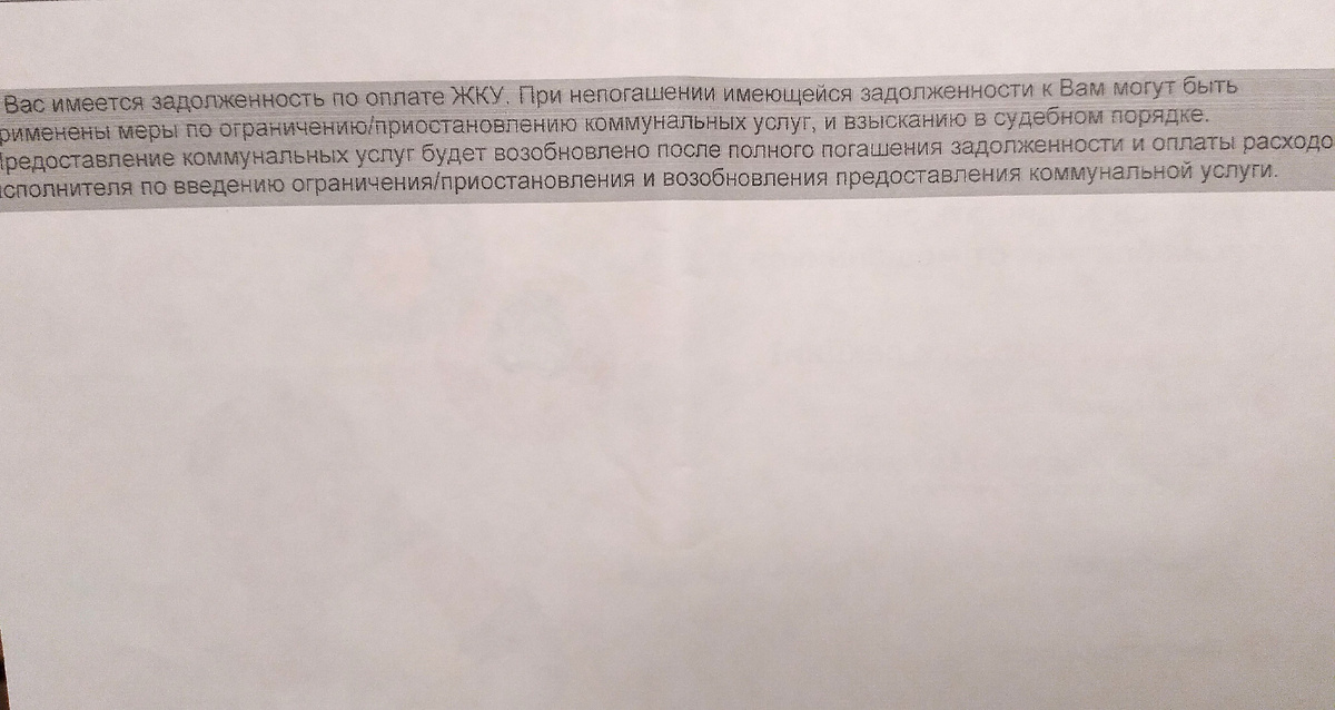 Пришла очередная платёжка ЖКУ с таким уведомлением: «у вас имеется задолженность по оплате ЖКУ. При непогашении имеющейся задолженности к вам могут быть применены меры по ограничению / приостановлению коммунальных услуг и взысканию в судебном порядке. Предоставление коммунальных услуг будет возобновлено после полного погашения задолженности и оплаты расходов исполнителя по введению ограничения / приостановления и возобновления предоставления коммунальные услуги». Они там в Жилищнике с ума посходили что-ли? Что за бред? Разве так нужно поступать с клиентами, на которых они наживаются десятилетиями? Однако дело не только в жилищнике, так устроено в нашем государстве, и такие нормы вызывают недоумение. Причина неуплаты: Я долго и сильно болел, не имел возможности работать, при этом лечение оказалось столь дорогим, что у меня не осталось ни копейки. Затем я возобновил работу, стал копить деньги чтобы оплатить ЖКХ, электричество, налог за квартиру, которые мне повадились выставлять по два