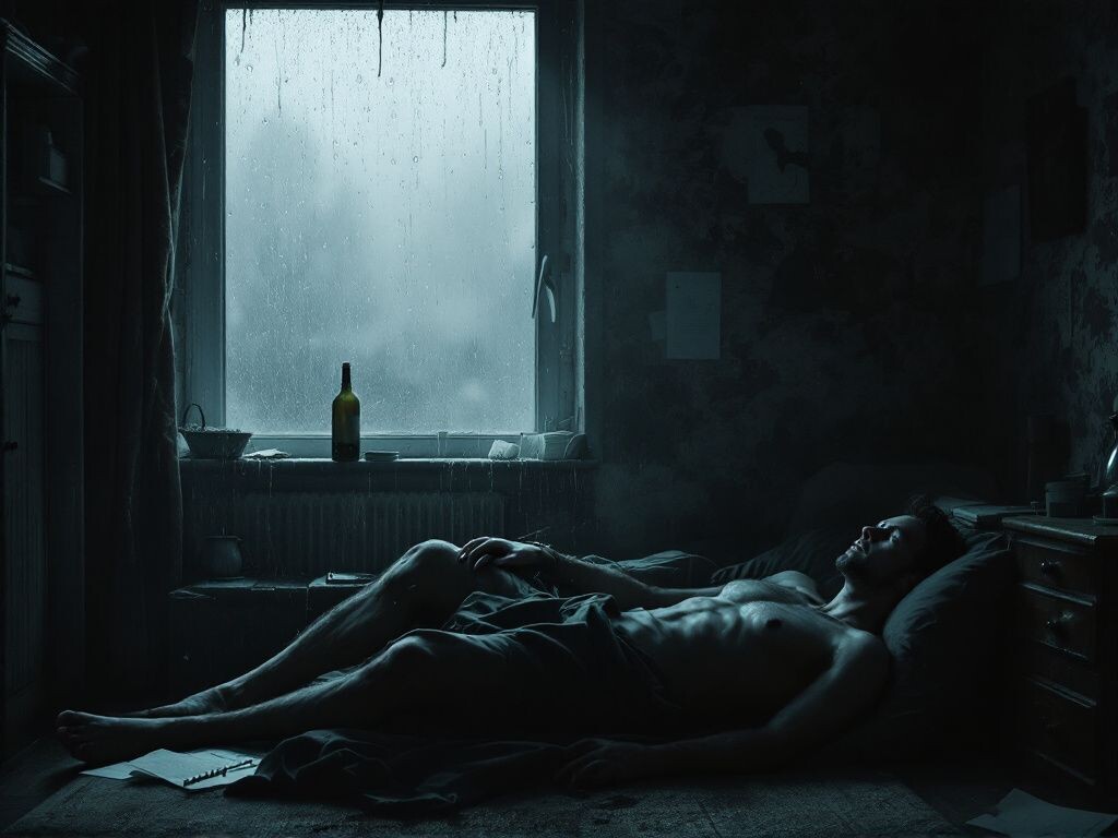 Утро в маленькой, полутемной комнате началось так же, как и каждое предыдущее. Игорь, мужчина лет тридцати, лежал на кровати, уставившись в потолок, покрытый пятнами от времени и влаги. Обшарпанные обои вокруг него напоминали о том, как давно он не делал ничего для улучшения своей жизни. В углах комнаты скапливалась пыль, а на подоконнике стояла пустая бутылка из-под вина, которая когда-то была частью вечерних ритуалов. За окном шумел дождь, создавая ощущение, что мир за пределами его комнаты был таким же серым и безжизненным.