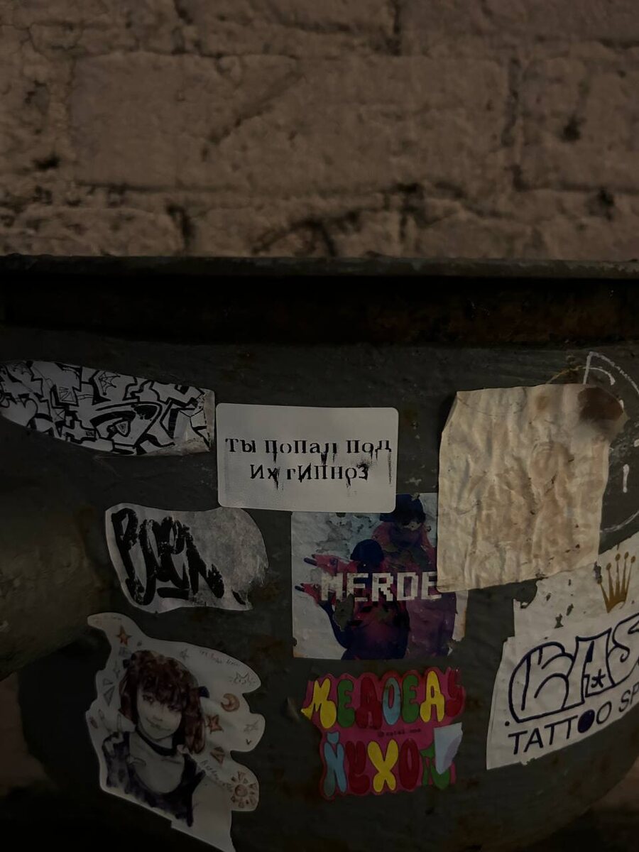 Что же означает эта загадочная фраза, появившаяся на улицах Москвы в качестве такого простого стикера? Ты попал под их гипноз - наклейки простой прямоугольной формы с незамысловатым содержанием, отражающим недовольство в сторону людей, что живут по правилам, давно навязанным им брендами, корпорациями, и другой массой А также, крепко связан с треком группы V3L3M3NTS - "Догма", первым треком дуэта двух очень творческих персон - Святослава Косарева и Вероники Чернышевой Первый из которых также известен как WHUZIT - творец, инструменталист, художник, певец, композитор, аранжировщик Данные стикеры начали появляться в январе 2025го года, и с тех пор сам часто вижу и подмечаю их Рад, что так удачно получилось познакомиться с создателями и добавить в плейлист кучу классных песен, просто изучая стрит арт