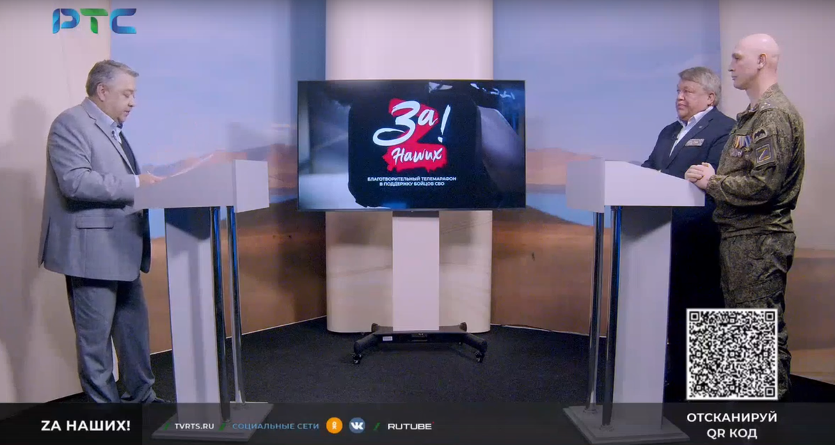 Патриотическая благотворительная акция проводится уже в четырнадцатый раз. Во время прямого эфира на экран выведен QR-код, с помощью которого можно перечислить деньги для участников спецоперации из Хакасии. Поддержка необходима и жителям Курской области, пострадавшим от киевской хунты. Гости в студии РТС – военнослужащие, общественники, волонтёры и депутаты. Ветераны боевых действий Общероссийской общественной организации “РОССИЙСКИЙ СОЮЗ ВЕТЕРАНОВ АФГАНИСТАНА и СПЕЦИАЛЬНЫХ ВОЕННЫХ ОПЕРАЦИЙ” в Республике Хакасия Александр Векшин и Евгений Еранцев приняли активное участие в телемарафоне по сбору финансовых средств для нужд участников СВО. Смотрите полную видеоверсию трансляции.
