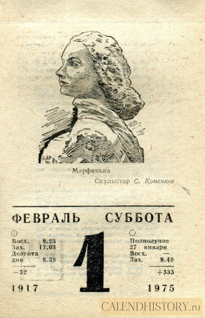 Итак, сегодня 1-го февраля и у нас на календаре 1975-й год. Перед нами листок советского календаря для женщин. На календаре у нас суббота - 1 февраля 1975-го года. Марфинька. Скульптор С. Коненков *** Оборотную сторону листка этого календаря можно посмотреть у нас по ссылке на сайте. Другие листки советских календарей смотрите у нас на сайте - CALENDHISTORY.ru ПОСМОТРИТЕ ЕЩЁ ЛИСТКИ ОТРЫВНЫХ КАЛЕНДАРЕЙ: