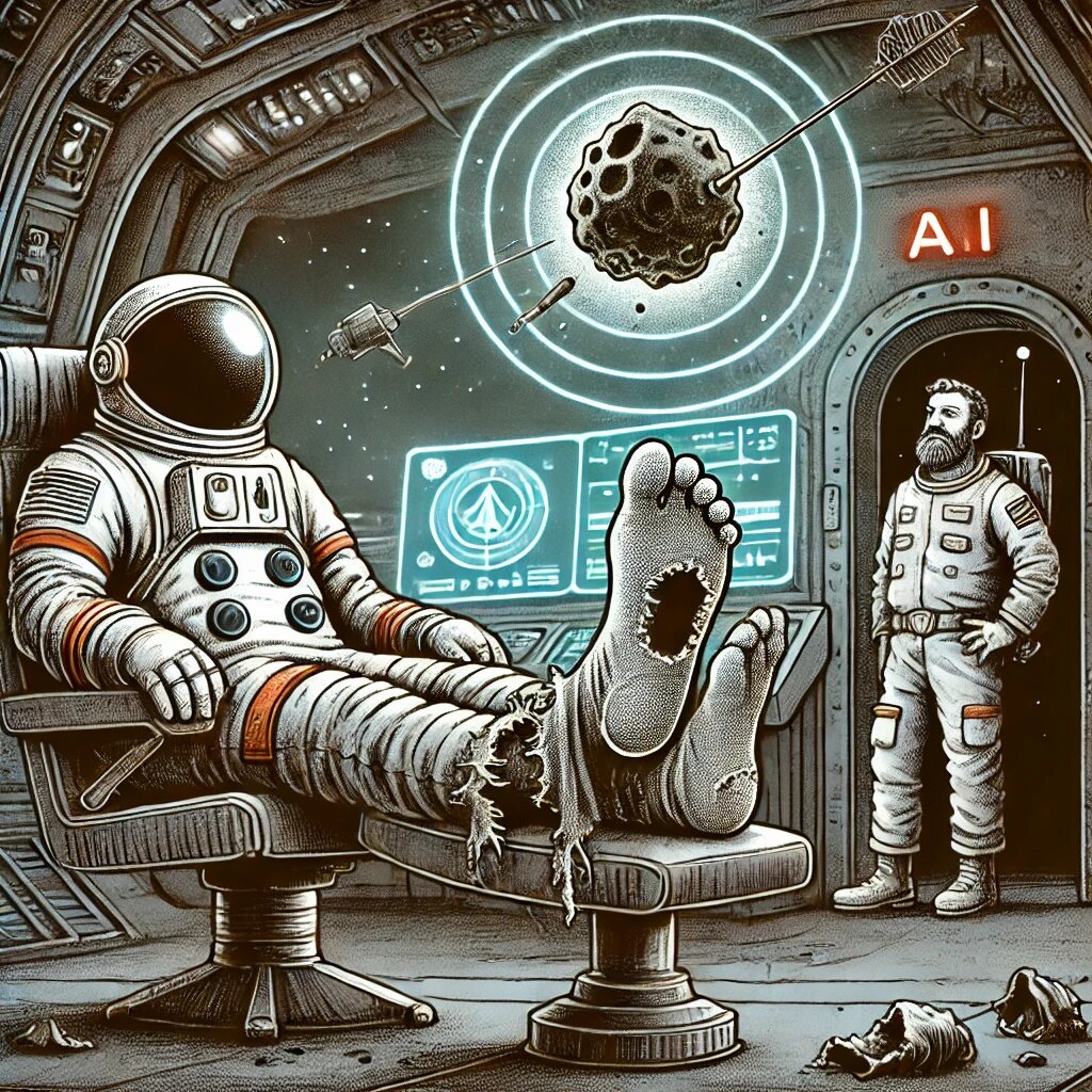 Когда завыла сирена противометеоритной защиты, ступни Пола, одетые в когда-то синие, а сейчас неопределённого цвета носки, ещё и с дыркой, из которой нелепо торчал правый большой палец, находились в традиционной позиции – то есть, на верхней панели главного пульта управления. А тело, как бы откинувшись на подголовник кресла, стоявшего всего на двух колёсиках из пяти, нежилось в почти лежачем положении. Про то, что напарничек, вместо того, чтоб бдить в обзорные экраны, или приборы, читал очередную книжонку в кричаще-розовой бумажной обложке, можно и не упоминать.
