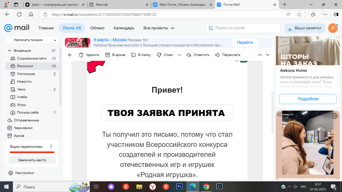 Вчера на почту мне пришло письмо, что я официально являюсь участницей конкурса "Родная игрушка". С этим конкурсом всё не так просто. Хотела предложить на конкурс эскиз куклы - героини моей книги про девочку, которая под воздействием колдовских сил превращается в Принцессу-медузку. Протестила идею на небольшой фокус-группе. Получила скептические отзывы, типа не время для принцесс. А почему? Девочки любят играть в куклы. И принцесс обожают. Ну, в общем, я отправила на конкурс другую заявку. И теперь у меня вопрос: а как у нас обстоят дела с авторским правом? Победителей конкурса объявят 1 сентября. А не получится ли так, что по принципу "все идеи витают в воздухе", на рыне появится игрушка, аналогичная моей? И как я докажу своё авторство?https://dzen.ru/a/ZPgKM5mVE1QL1NTW