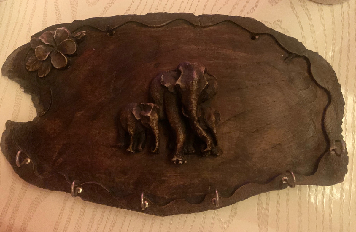 Увлекательное занятие меня всё таки затянуло. Долго я собиралась, изучала информацию. Но всё таки решилась. Начала с малого- ключница. При просмотре нашего будущего дома мы обнаружили ключницу со слонами. Это был один из знаков, что дом наш! Мы с мужем коллекционируем слонов. Обнаружили мы вот такую ключницу На спиле дерева фигурки слонов. Так как у нас в новом доме светлый интерьер, я ее обновила. Вторым моим творением стал посудный шкаф. Досталась мне тумбочка. Совсем не ценная, с множеством повреждений. Ну, как раз то, что нужно, чтобы набить руку, подумала я. И приступила к работе. В нашем новом доме планируется крытая терраса. Там будет мангал , камин, обеденная группа. Всё, преимущественно, в темном (графитовом) цвете. И решила я из этой тумбы сделать посудный шкаф. Долго над ним колдовала и, наконец то, осталась довольна результатом . Затем я вошла в раж и решила исполнить своё давнее желание- лестницу и двери на первом этаже в доме, в котором мы живем, сдела