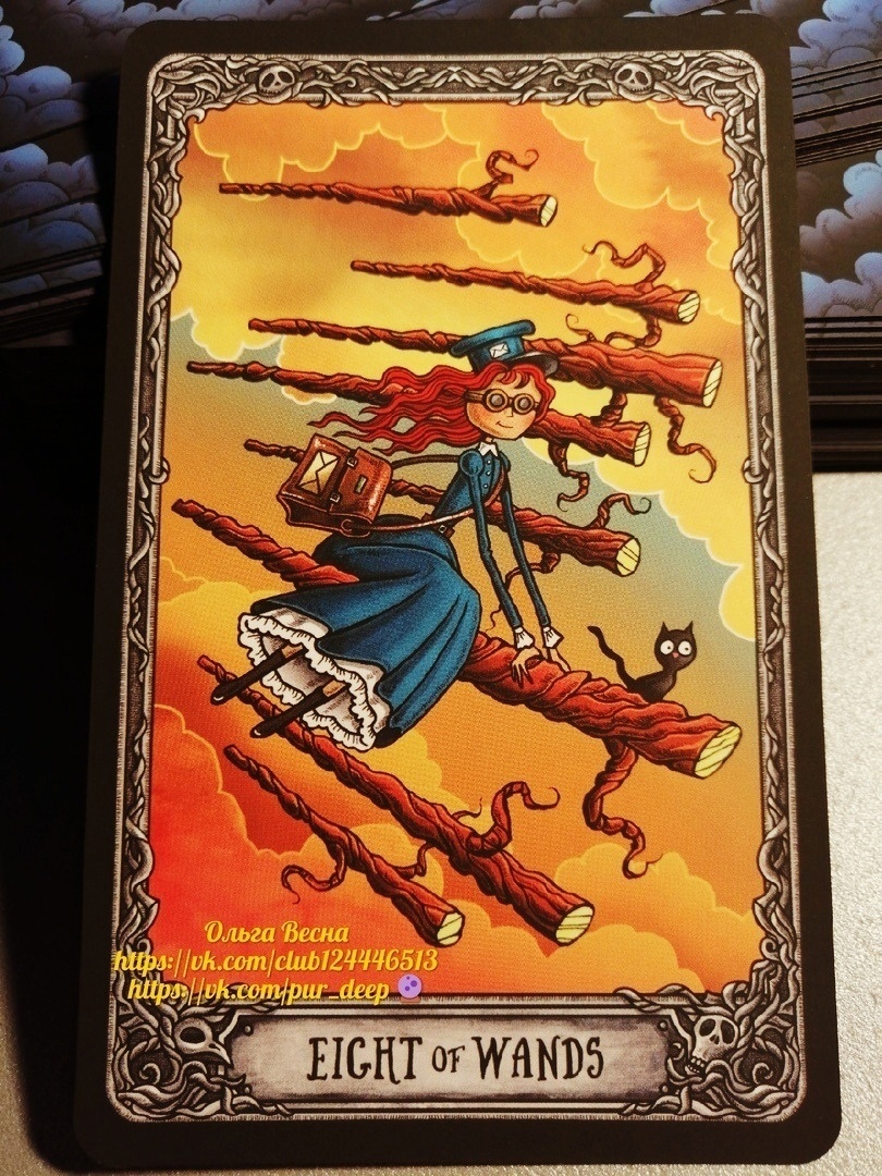 Восьмерка Жезлов служит индикатором «всего быстрого» - гонок, электронной почты. Это «экспресс»карта, и стрел любви это тоже касается. Это не тот случай, когда люди долго присматриваются, принюхиваются и притираются друг к другу. Тут оглянуться не успеешь, как обнаружишь, что голова потеряна, влюбленность прогрессирует и события развиваются на пятой скорости.