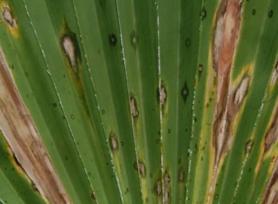 Розовая гниль поражает корни пальмы, а на листьях и стволе появляется мокрые розовые, коричневые или бурые пятна. Через некоторое время ствол загнивает, и растение погибает.