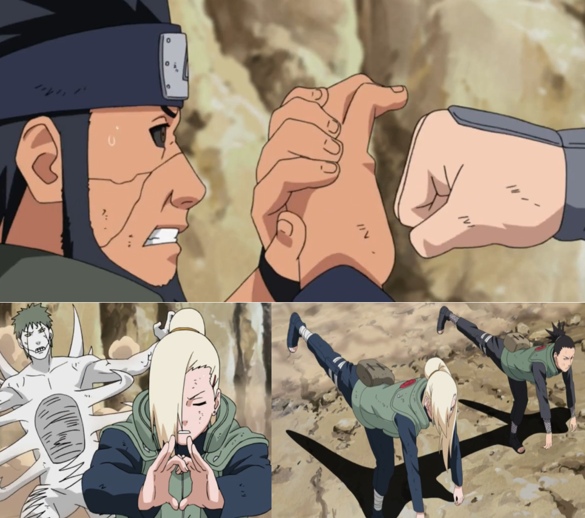 Что бы Чоджи не умер от мгновенно последовавшей контратаки, Ино пришлось взять под контроль его разум и уклоняться, насколько это возможно (т.е Чоджи самостоятельно даже не хотел парировать атаки), а пока Ино берёт кого-то под контроль, то своё тело она не контролирует (ну, хоть научилась стоять, а не сваливаться наземь), поэтому теперь она стала уязвимой для взявшегося из ниоткуда Белого Зетсу, но тут вмешался Шикамару и с помощью Каге Мане но дзюцу управлял телом Ино таким способом, что бы она КАК БЫ отбила ногой набросившегося сзади Зетсу.