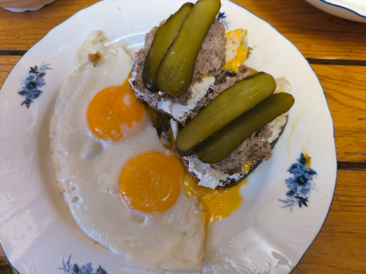 Решив, что не буду грустить из-за того, на что не могу повлиять (и не только из-за погоды) отправилась на кухню пить свою утреннюю чашку чая и готовить завтрак. Холодильник опустел, сегодня будем пополнять запасы. Поэтому завтрак из тех продуктов,что есть в холодильнике: яичница, бутерброды с творожным сыром, жареным яйцом (у одного яйца на сковородке расплылся желток, так я его в бутерброд порезала), с единственной оставшейся котлетой из домашнего фарша (вчера готовила) и маринованным огурчиком ( открыла банку ассорти). Ну и чай с лимоном. У супруга ещё печенье песочное к чаю.