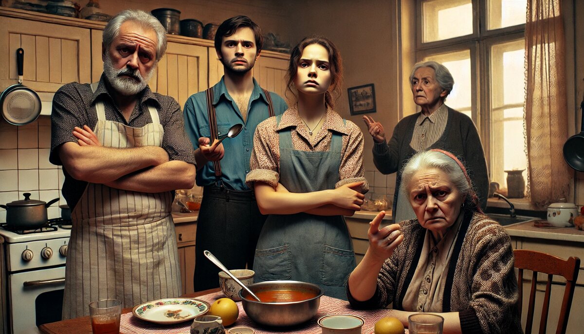 Вечером, когда все собрались ужинать, воздух буквально накалился. Олег разогрел котлеты и поставил на стол тарелку с тушёными овощами. Дядя Анатолий уже пробовал салат и посыпал всё комментариями: