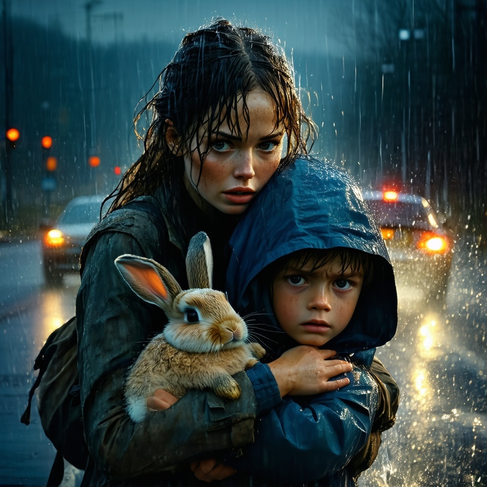 И вдруг — крик. Детский, резкий, полный паники. Женщина подняла голову. В паре метров впереди, прямо на проезжей части, стоял мальчик. Маленький, худенький, в синей куртке с капюшоном, вцепившись в плюшевого зайца. Он не двигался, только смотрел в сторону приближающейся машины, замерший, как окаменелая статуя.