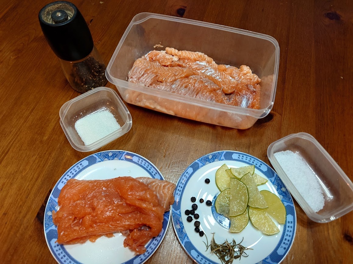 Когда стала солить рыбу сама, перестала покупать готовую продукцию в магазинах. Во-первых, вкус получается совсем иным. Во-вторых, цена покупной солёной рыбы выше, чем делать самой. Минус один – с красной рыбой придётся повозиться в плане её разделки. Но я уже приспособилась, поэтому трачу на это немного времени. А засолка скумбрии вообще не представляет хлопот. Поэтому хочу поделиться двумя рецептами. Один – для красной рыбы (у меня форель), второй – для скумбрии. Филе красной рыбы – 0.5 кг Соль – 1.5 ст. л. Сахар – 0.5 ст. л. Ягоды можжевельника – 5-7 шт. Перец молотый Розмарин сушёный Коньяк – 1 ст. л. (или несколько долек лимона/лайма) 1. Готовим все продукты. 2. В тару укладываем рыбу и распределяем равномерно специи, соль, сахар, коньяк или лимон/лайм. Я обычно готовлю с коньяком, но в этот раз оказался под рукой только лайм. 3. Рыбу накрываем пищевой плёнкой, ставим на сутки в холодильник под пресс. Рыба готова! Скумбрия – 3 небольших Лук репчатый – 1 шт. Лук красный – 1 шт. Во