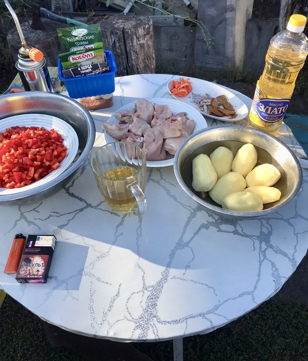 Блюдо грузинской кухни. Расскажу как готовлю его Я. Я не приемник готовить по рецептам, соблюдая каноны той или иной кухни и тд, готовлю в удовольствие проводя время у мангала. Когда шашлыков уже не хочется, приходит время казана. Итак, нам потребуется Приступим к процессу приготовления. Для начала необходимо прокалить казан, после чего налить в него масло и хорошо разогреть. В это время я помещаю в казан около килограмма куриных грудок. Важно периодически помешивать, чтобы мясо приобрело румяную корочку. Мне удобнее готовить курицу порционно, чтобы обеспечить равномерное прожаривание. И откладываю ее пока с сторону. Затем приступаю обжаривать лук, перец и томаты… И все женим между собой… Затем выкладываю картофель, курицу, специи, зелень и всё заливаю горячей водой… Готовим до готовности картофеля.