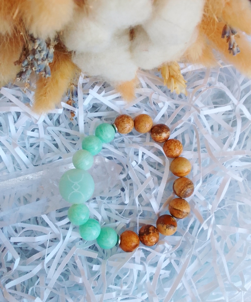 Браслет состоит из натуральных камней амазонита, пейзажной яшмы и руны «Путь». Русская руна «Путь» олицетворяет собой начало начал, открытие любого дела, исток любого мероприятия, источник всего, является своеобразным энергетическим источником, позволяющим пробить путь на пути к успеху, раскрыть энергетический канал связи с Вселенной. Помогает руна «Путь» в решении любой ситуации, так как она позволяет определить верную траекторию нужных действий. Руна определяет путь человека и позволяет держаться его при любых жизненных трудностях. Если же человек сбивается, оступается со своего жизненного пути, руна возвращает его на праведный, предначертанный ему путь. Амазонит - это камень успеха и изобилия, который притягивает удачу и благополучие. Он успокаивает нервную систему, способствует уменьшению беспокойства и нервозности, уравновешивает ментальное и эфирное тела, приносит радость и духовный подъём, способствует восстановлению энергии, повышает настроение, учит мыслить трезво, бережёт