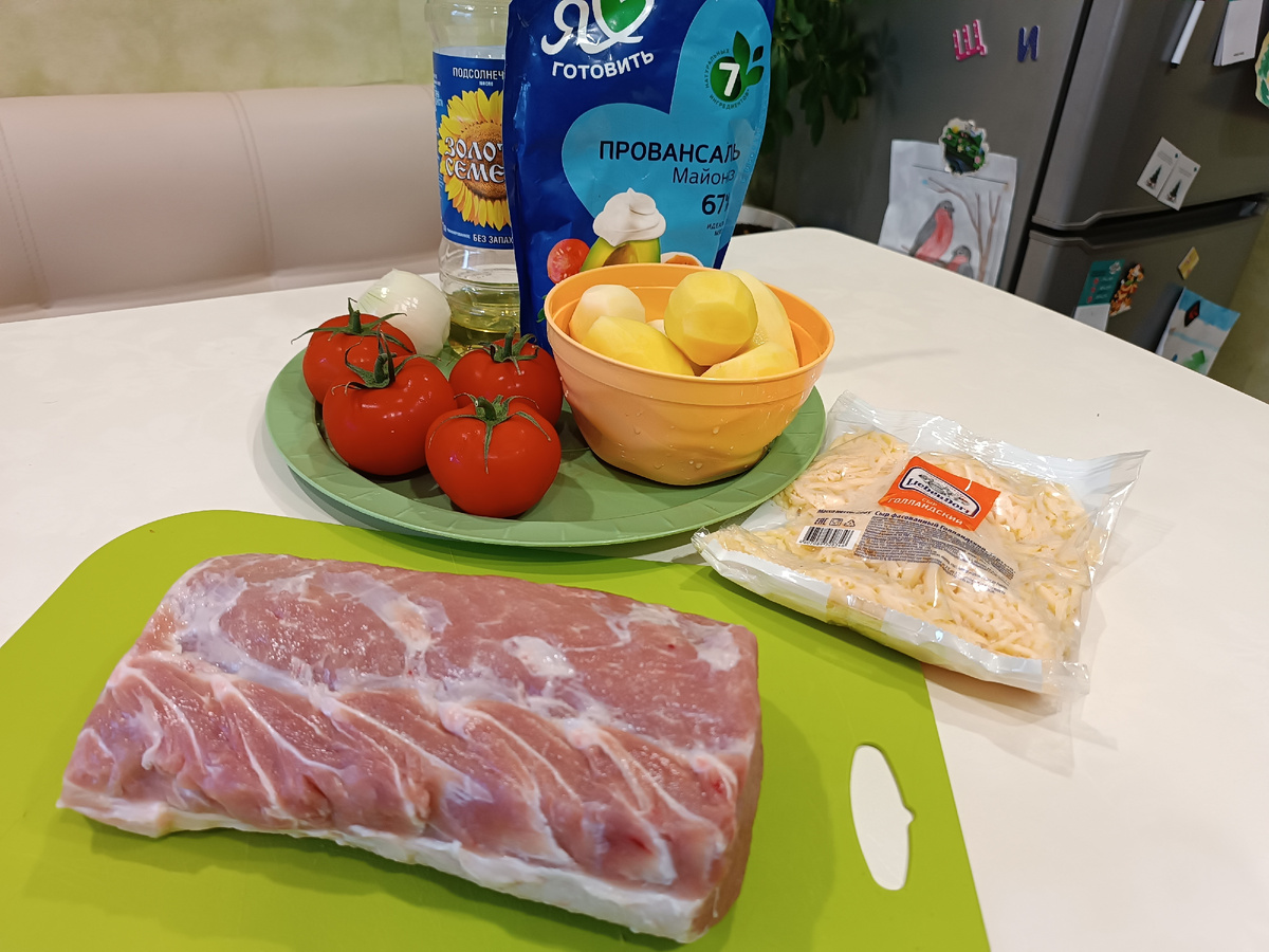 У каждого рецепт этого блюда свой. С грибами и без, с картофелем,помидорами, кто-то добавляет даже горчицу и соевый соус. Я уже много лет готовлю мясо по-французски по одному рецепту, которым хочу сегодня поделиться с вами. Ингредиенты Приготовление Мясо режем на ломтики толщиной примерно 1 см. Каждый ломтик посыпаем солью и перцем. Картошку и помидоры режем тонкими кружочками, а лук - полукольцами. В картофель добавляем соль по вкусу, перемешиваем. На дно противеня наливаем небольшое количество растительного масла, выкладываем в один слой картофель. Сверху кладём мясо. Свинину смазываем майонезом, раскладываем лук. Далее идут помидоры. Последний слой - это майонез, смешанный с половиной потертого сыра. Сверху посыпаем оставшимся сыром и отправляем в разогретую до 180° духовку на 50 минут. При желании можно оставить небольшую часть сыра и посыпать им блюдо за 15 минут до готовности. Получается сытно, вкусно и очень ароматно. Всем приятного аппетита!