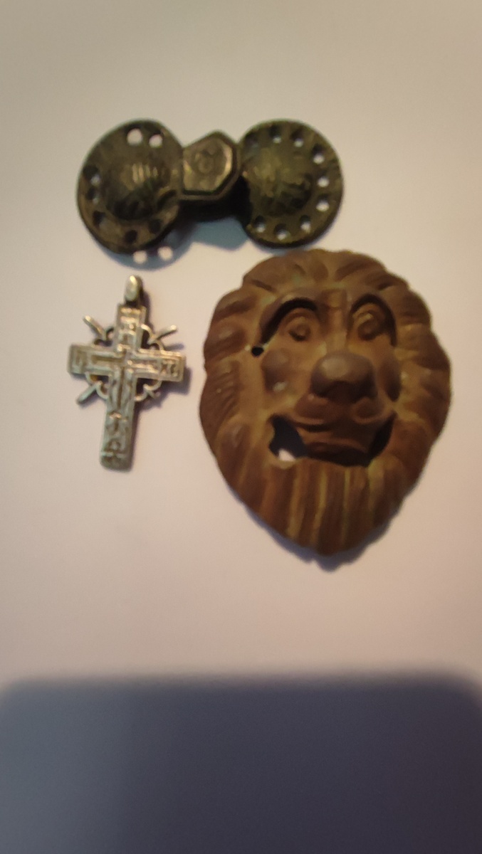 По поводу львиной морды есть разные мнения... В отверстиях левдолжен держать кольцо.... В которое продевается ремешок... И якобы это деталь полкового барабана времён Петра... Императора который. (это не моё мнение).