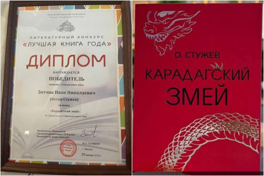 Остап Стужев был награжден за свой сборник рассказов «Карадагский змей», который завоевал титул книги года на конкурсе «Лучшая книга года». Это признание подчеркивает талант автора и его вклад в развитие русской литературы. В ответном слове писатель Остап Стужев выразил благодарность членам жюри конкурса за выбор его книги в качестве победителя. В заключение он подчеркнул, что в романе "Карадагский змей" ему удалось с помощью формул квантовой теории дать научное объяснение такому уникальному явлению как временные флуктуации, приводящие к физическому подтверждению визуализации дифракционного распределения элементарных частиц, создающих иллюзию в виде огромного морского чудовища. В сборнике рассказов "Карадагский змей" представлены и другие произведения писателя. Одно из них "Выбор", рассказывает о спортсмене-самбисте, который в силу проблем со слухом считается непригодным для службы в подразделениях Министерства обороны России. После начала СВО, герой этого рассказа ищет возможности пре