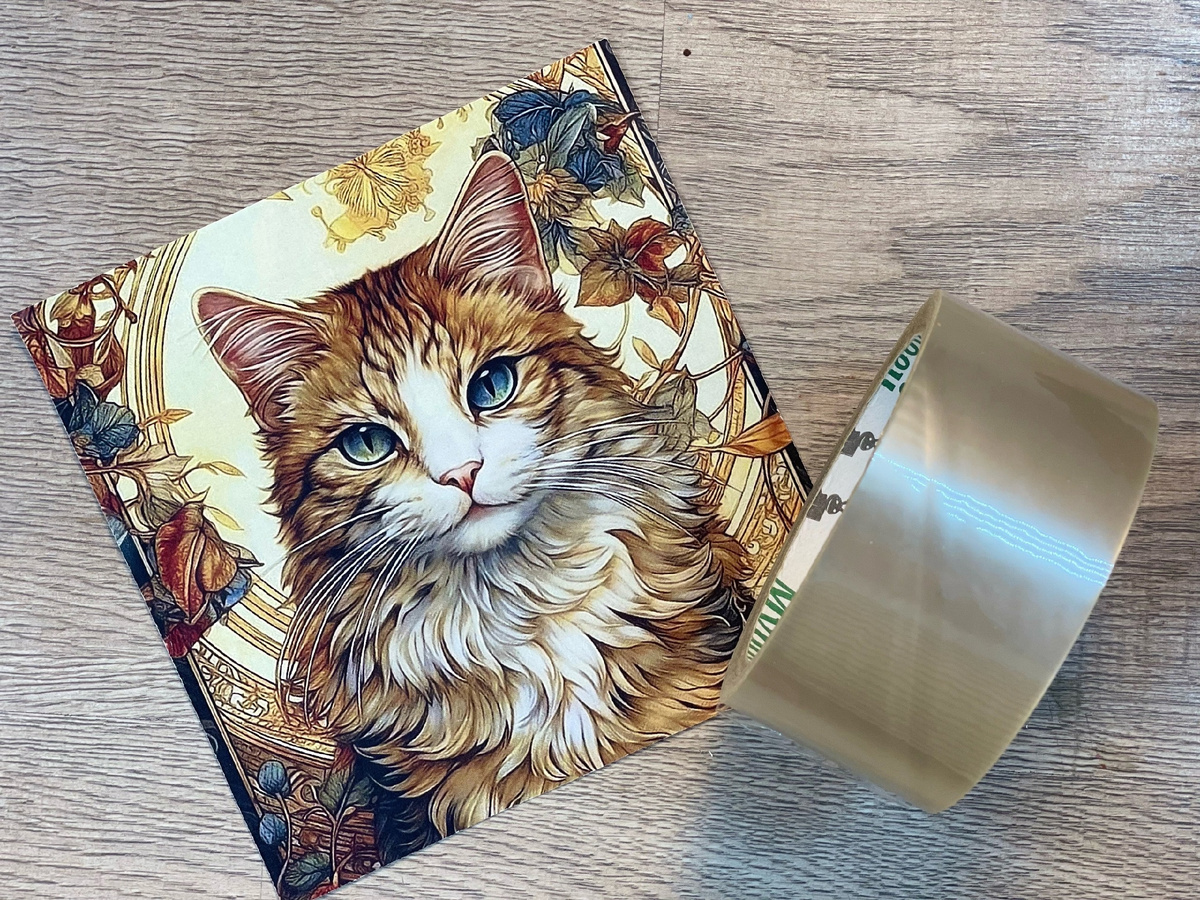 В декупаже часто используются распечатки, которые делаются на лазерном принтере на обычной офисной бумаге. Когда эта распечатка идет, что называется, в размер, её толщина не является проблемой, а в ситуациях, когда распечатка меньше области приклеивания, необходимо ее либо вживить, либо истончить. О вживлении есть отдельная статья А сегодня покажу как я истончаю распечатку с помощью скотча, способ этот не новый, им пользуются многие мастера, при определенной «ловкости рук» он работает отлично. На обратную сторону распечатки приклеиваем полоску скотча. Затем еще одну и еще одну, пока не заполним всю площадь распечатки. Каждая следующая полоска должна заходить на предыдущую миллиметров на 5. После этого резиновым шпателем очень тщательно прижимаем скотч к поверхности бумаги. Далее подцепляем скотч с одного уголка и очень аккуратно тянем «на себя» параллельно поверхности. Это важно, тянем не наверх, а именно параллельно столу. После того, как сняли весь скотч, приклеиваем новый слой и по