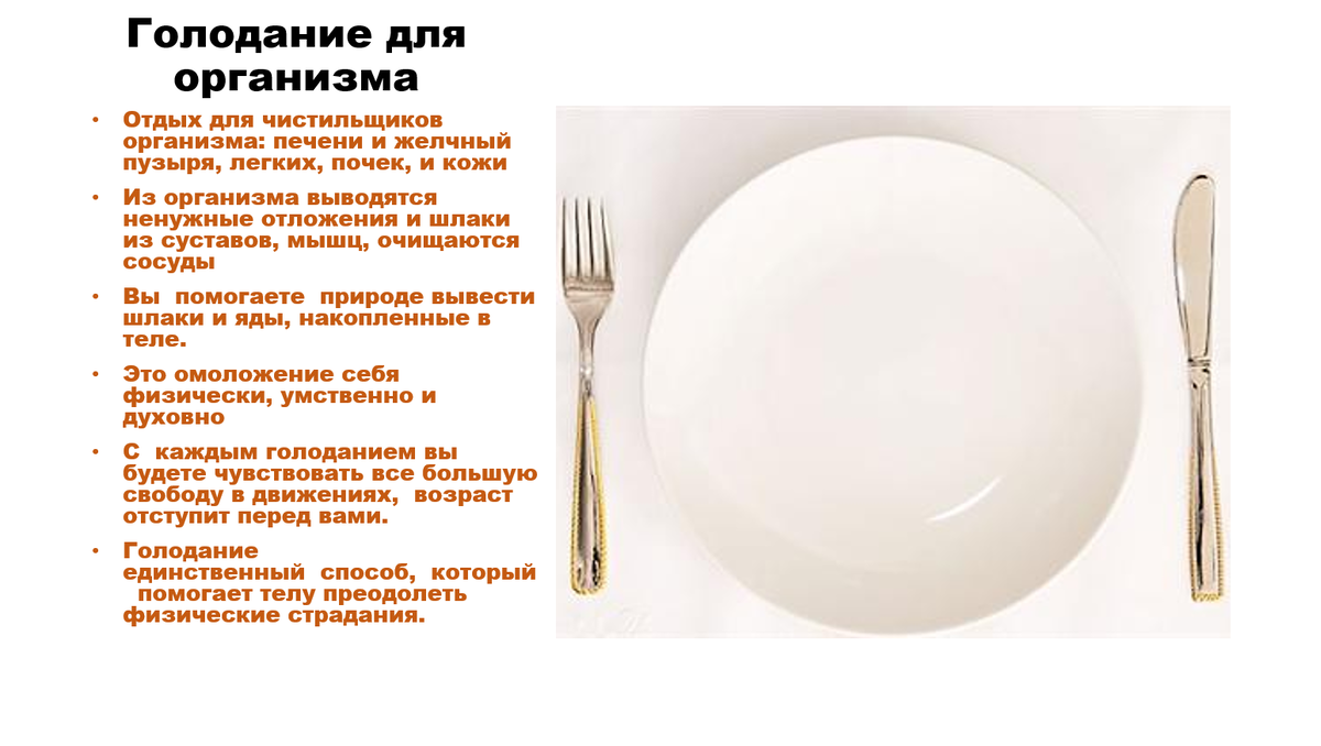 - Ведь тело создано, как само восстанавливающаяся, само исцеляющая, само регенерирующая система. Я говорю - ей лучше всего не мешать. И голодание - лучший для этого вариант поведения