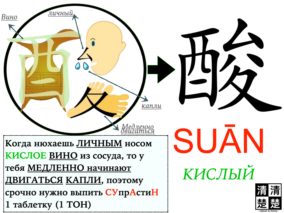 Предлагаю способ разбора на составляющие и запоминание с помощью мнемотехники, рассмотрим на примере слова 酸 - suān - кислый Ключом в иероглифе 酸 является 酉 (yǒu), который относится к категории иероглифов, связанных с алкоголем, ферментацией или брожением. Встречается, например, в 酒 - jiǔ - алкоголь 酉 (yǒu) не путать с 西 (xī) - запад Правая часть иероглифа - это 夋 (qūn), которая не так часто встречается в других иероглифах (но всё же, например: 梭 - suō - веретено, а оно в свою очередь есть в названии рыбы: 梭鱼 - suōyú - барракуда) и ещё реже можно встретить как самостоятельное слово. Его этимология связана с образом медленного шага или движения вперёд с осторожностью. В иероглифе 酸, если рассматривать 夋 как морфему, можно интерпретировать его как символ чего-то, что происходит постепенно, например, процесс ферментации или созревания, который в итоге приводит к кислому вкусу. Как на картинке в 夋 можно выделить следующие элементы : 厶-личный 八-восемь (но можно рассмотреть как просто две "к